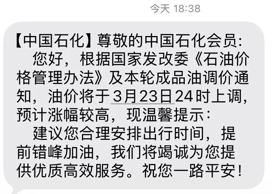 中国石化曾向全国会员群发短信,提醒车主油价或将大幅上调
