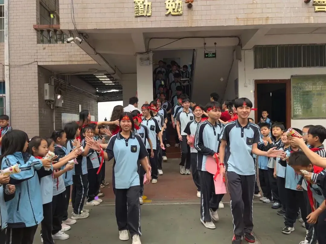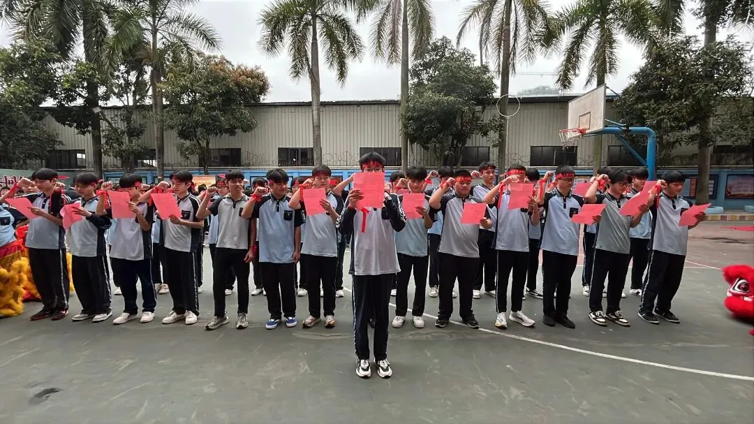 学校领导将象征拼搏与荣誉的战旗授予初三学子。旗帜挥舞间,齐呼口号:“百日鏖战,我必登巅!”誓言响彻云霄,彰显备考凝聚力。