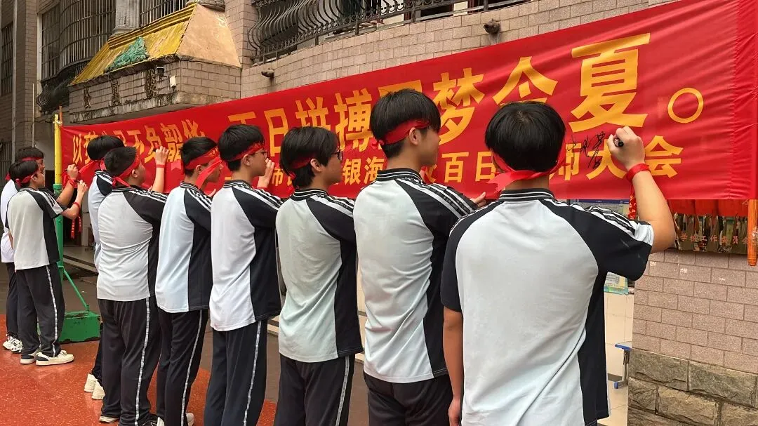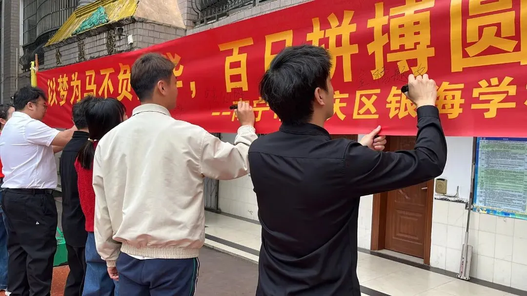 印有励志誓言的巨型横幅铺展在主席台前,老师和中考学子依次执笔,郑重签下自己的姓名,一笔一划皆是决心,把冲刺中考的信念镌刻在心上。