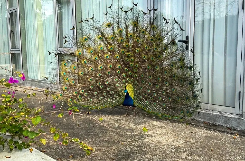 山庄里散养着许多动物,我们刚到的时候,就看见一只孔雀在开屏。雀伴龙马,实在是个好兆头。