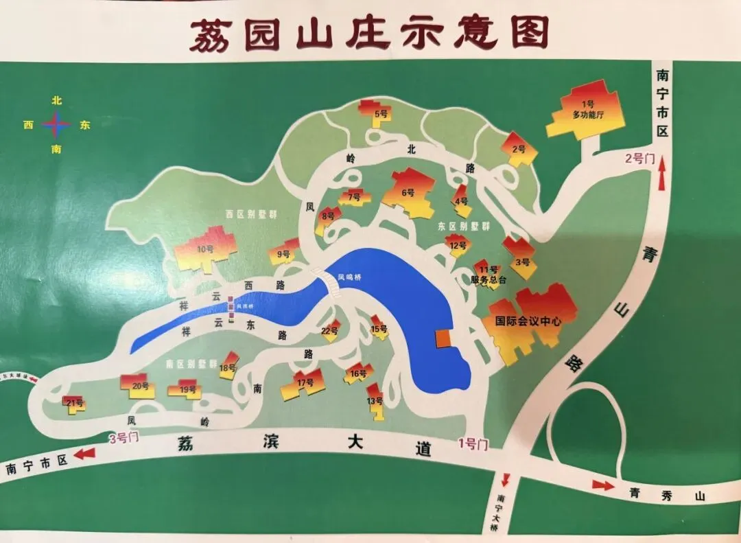 大巴载着我们,从城市的一侧缓缓穿过,在青秀山脚下拐弯,驶入了一个巨大的花园,这是我们此行第一晚的入住地——荔园山庄, 俗称广西 “国宾馆” 。