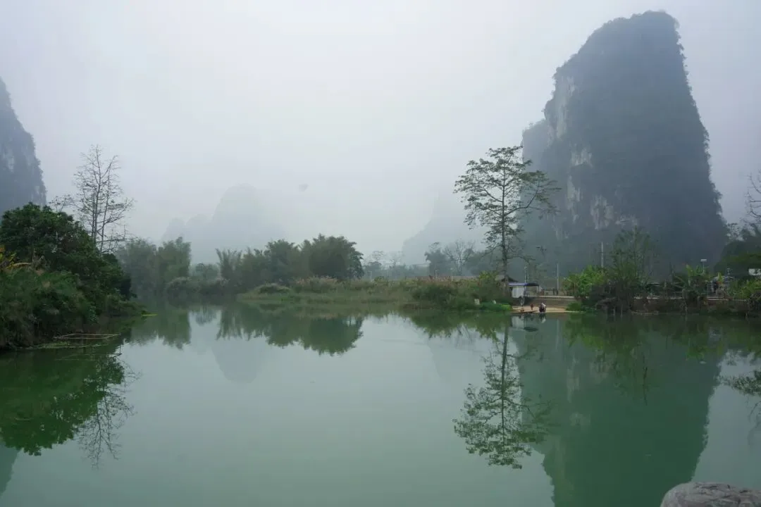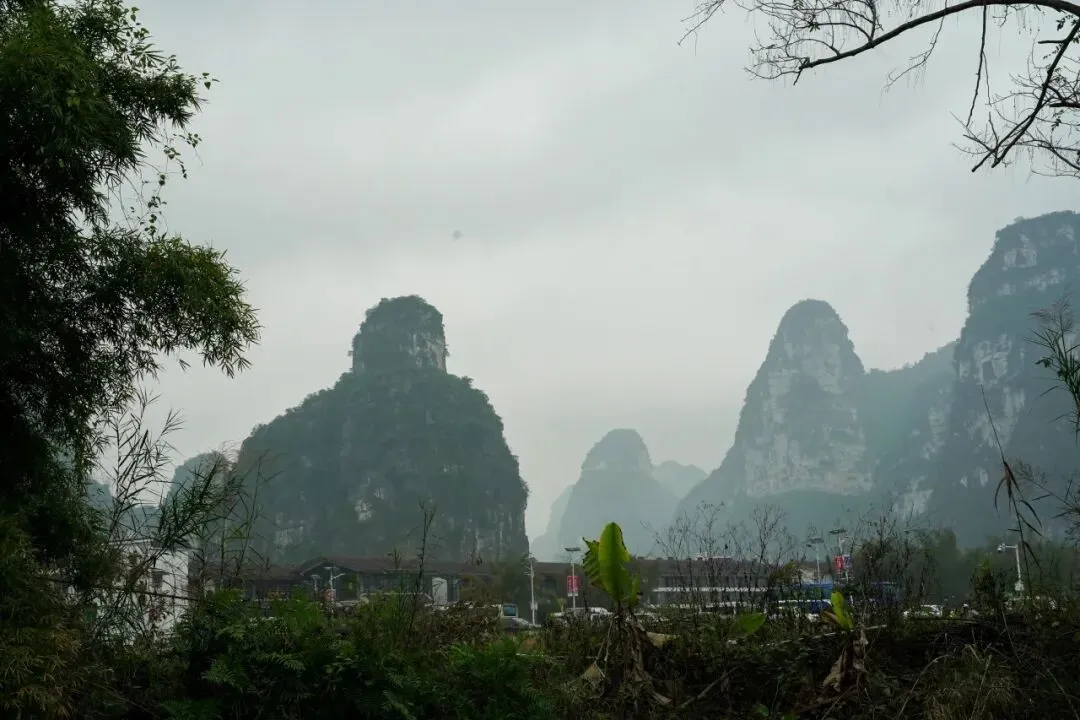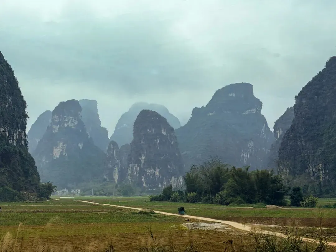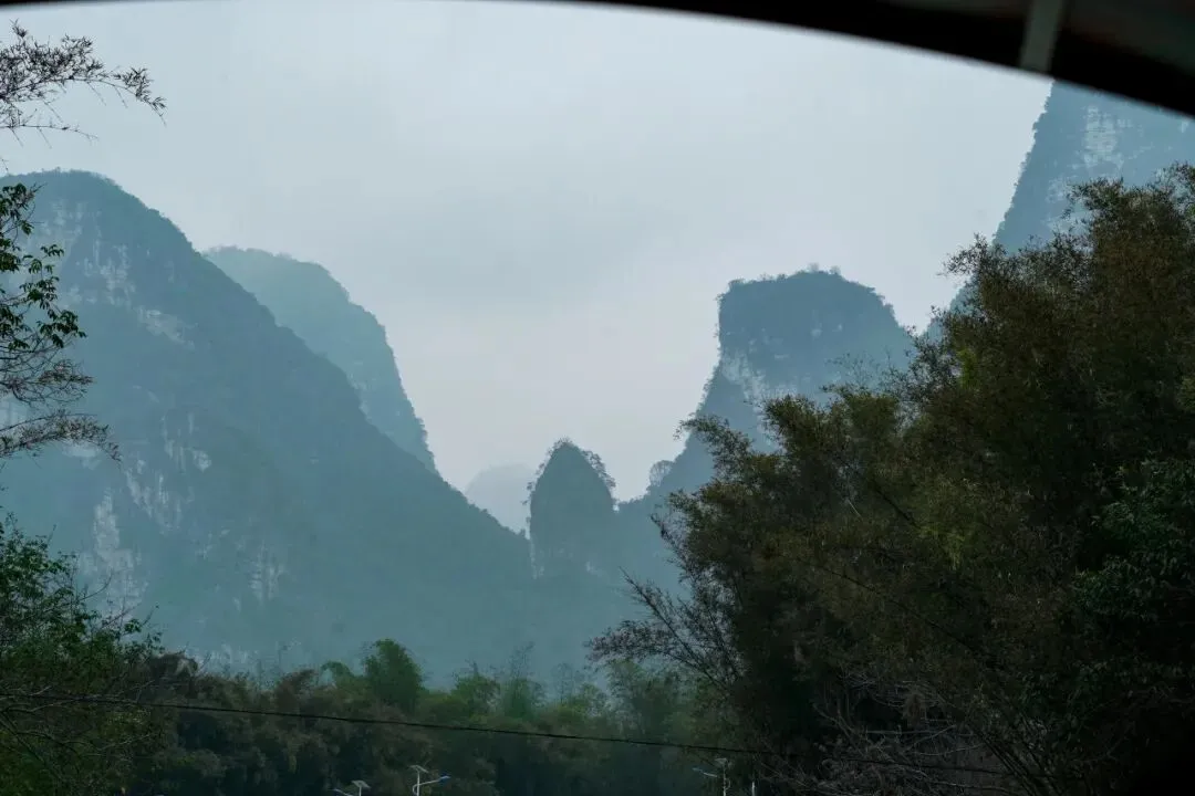 一路驶来,车流并没有想象中那般吓人。天空是淡淡的阴,远处的喀斯特峰林若隐若现,青黛色的轮廓连绵起伏,像是天地间随手勾勒的淡墨线条。