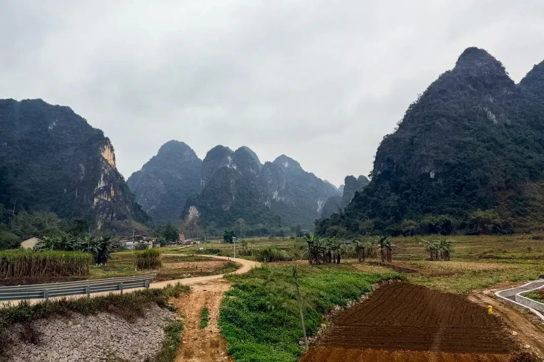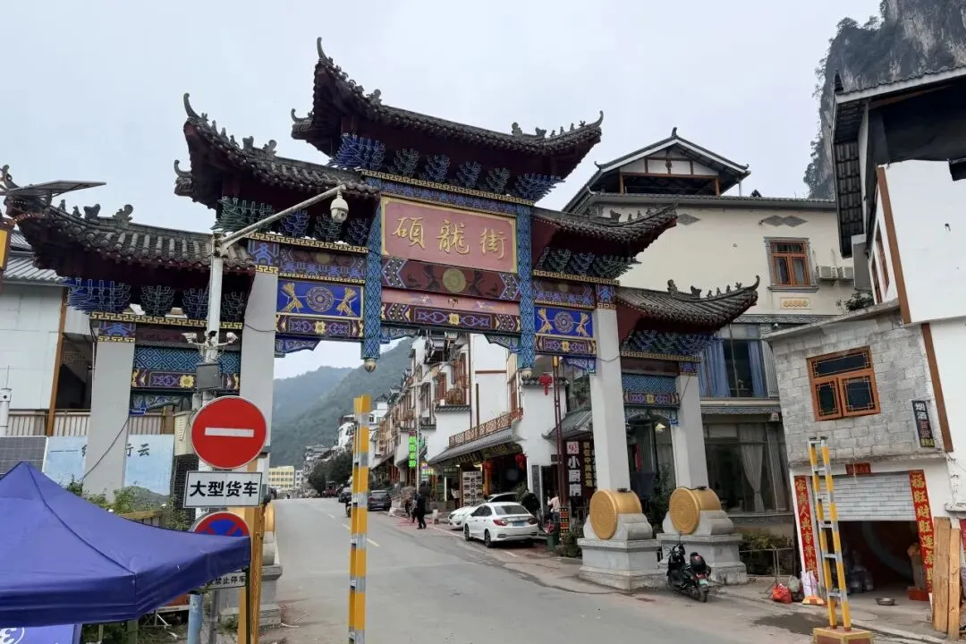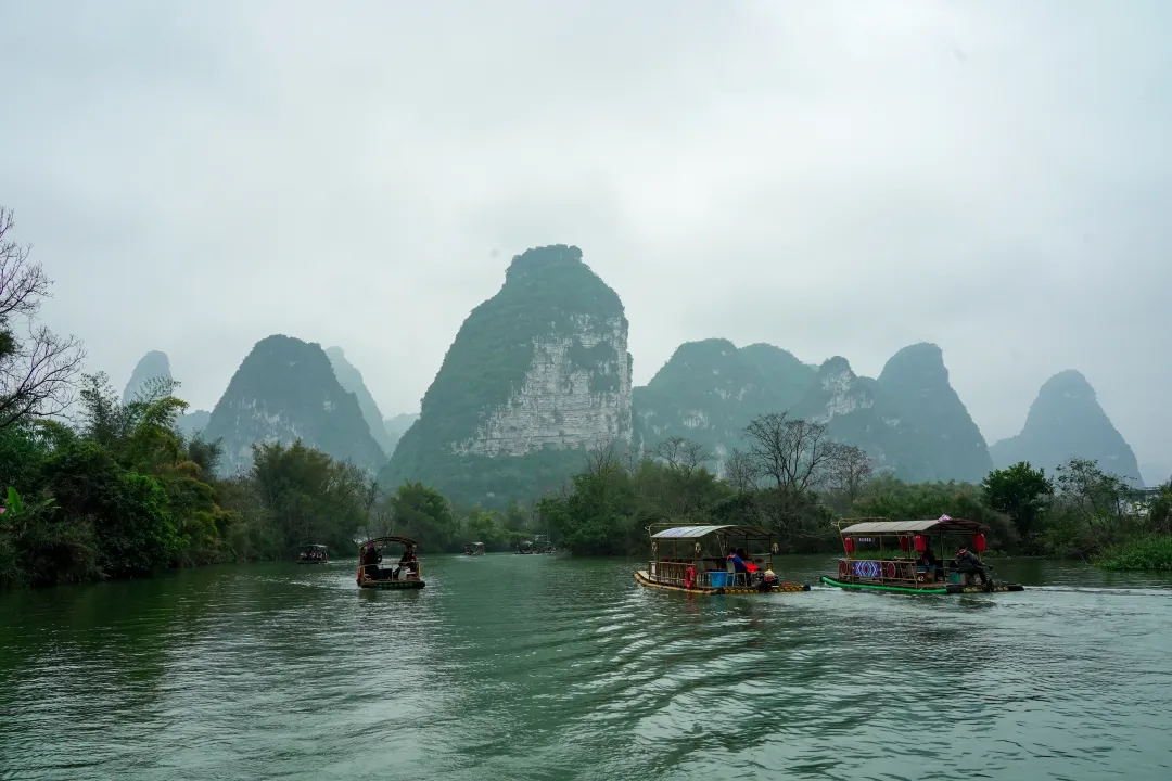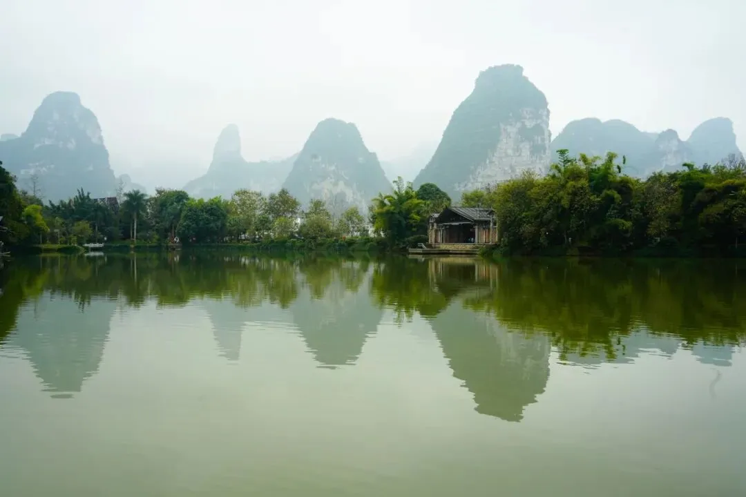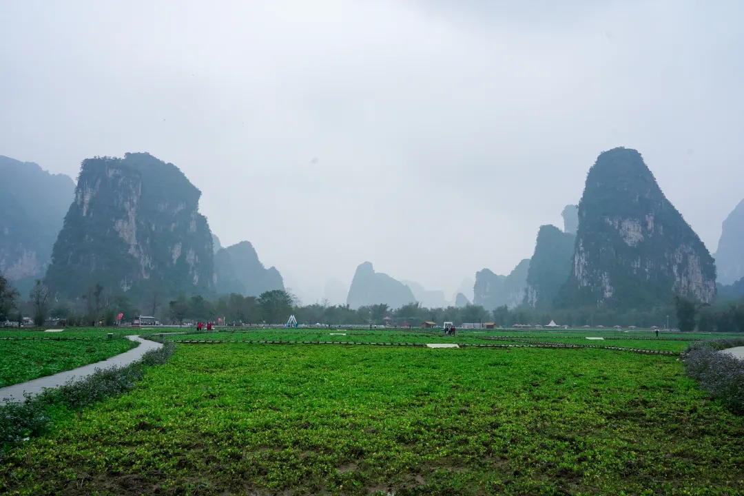 一路驶来,车流并没有想象中那般吓人。天空是淡淡的阴,远处的喀斯特峰林若隐若现,青黛色的轮廓连绵起伏,像是天地间随手勾勒的淡墨线条。
