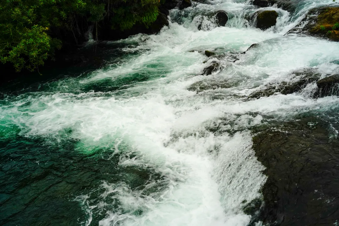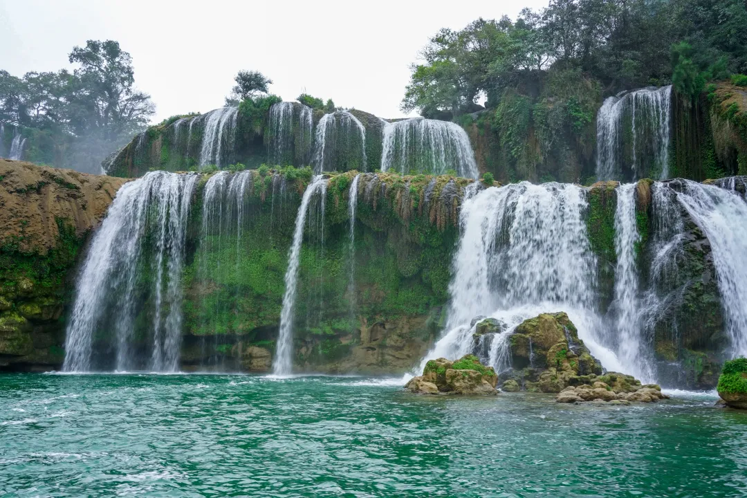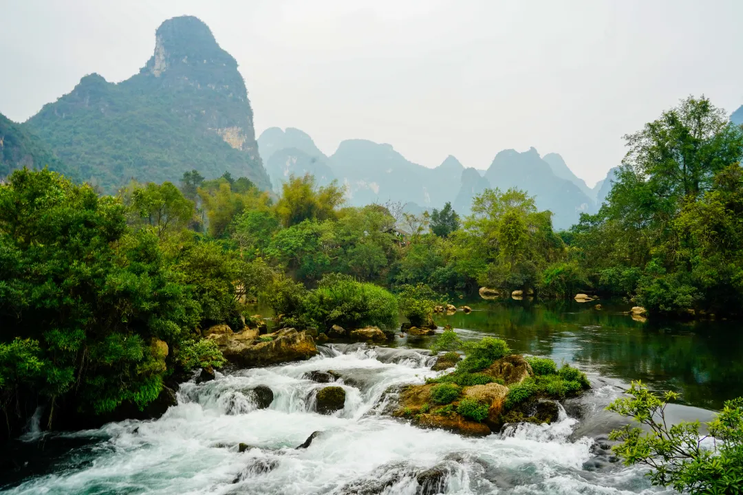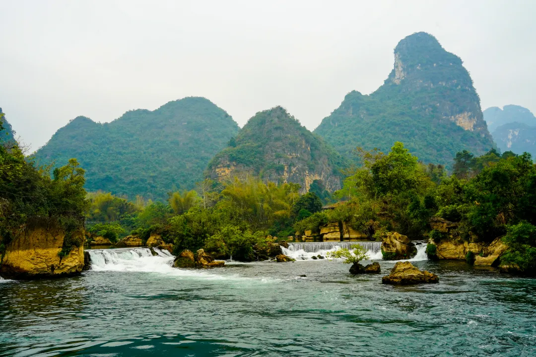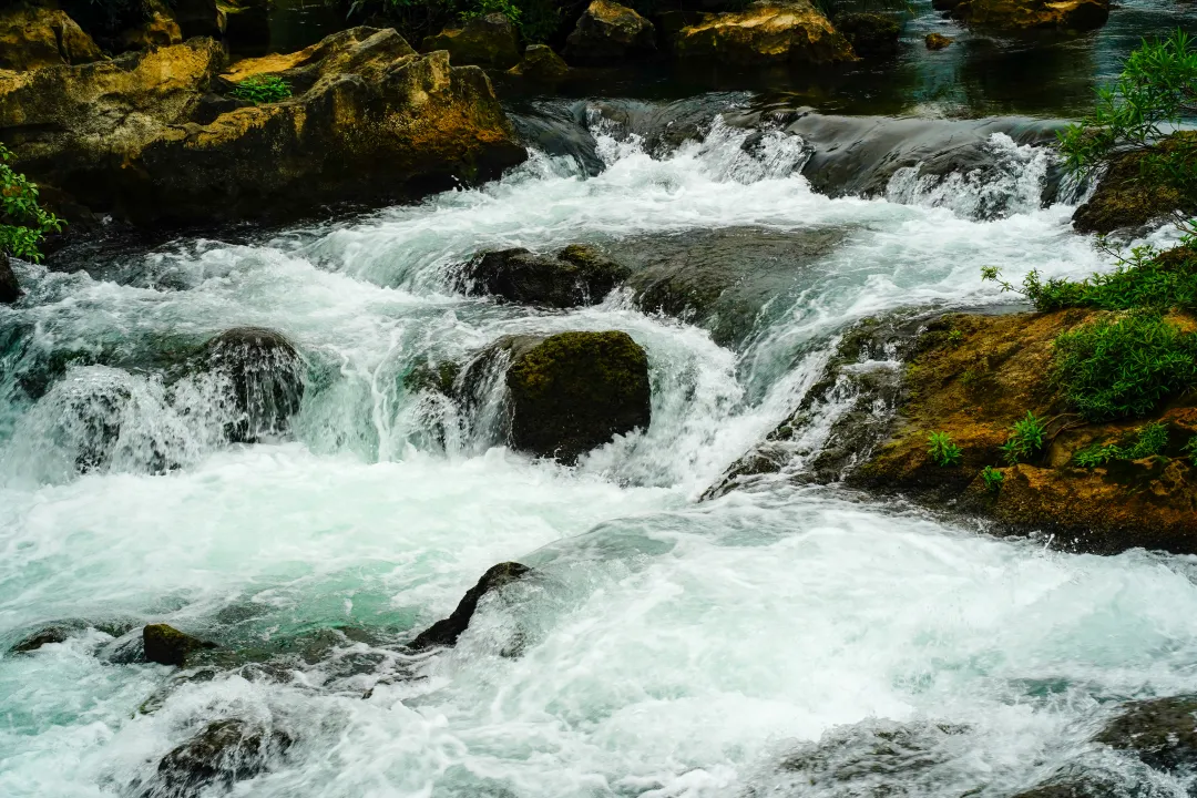 峒那屿湾最动人的景致,当属龙碧滩。黑水河蜿蜒至此,形成了一个宽约百米的叠瀑群,虽无“飞流直下三千尺”的磅礴落差,却层层错落,温婉有致,与远处的喀斯特山峰相映成趣,山有灵秀之气,水有灵动之姿,美得恰到好处。水色青碧如翡翠,水流湍急似奔雷,冲刷着岩石,荡起层层白色余波,宛如一条白龙穿梭于山石之间,身姿矫健,灵动洒脱。