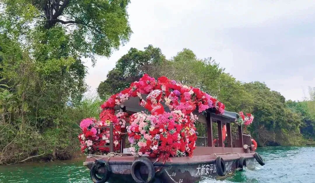 峒那屿湾的前身是安平仙河景区,在2023年才完成升级更名。“峒那屿湾”四个字,是壮语 + 汉语的组合,意为“山间水田旁、布满小岛的河湾”。在我看来,这里真的很像某个村子自发围起来搞了个景区收门票的样子,最大的宣传亮点,就是多年前电视剧《花千骨》曾在此取景。