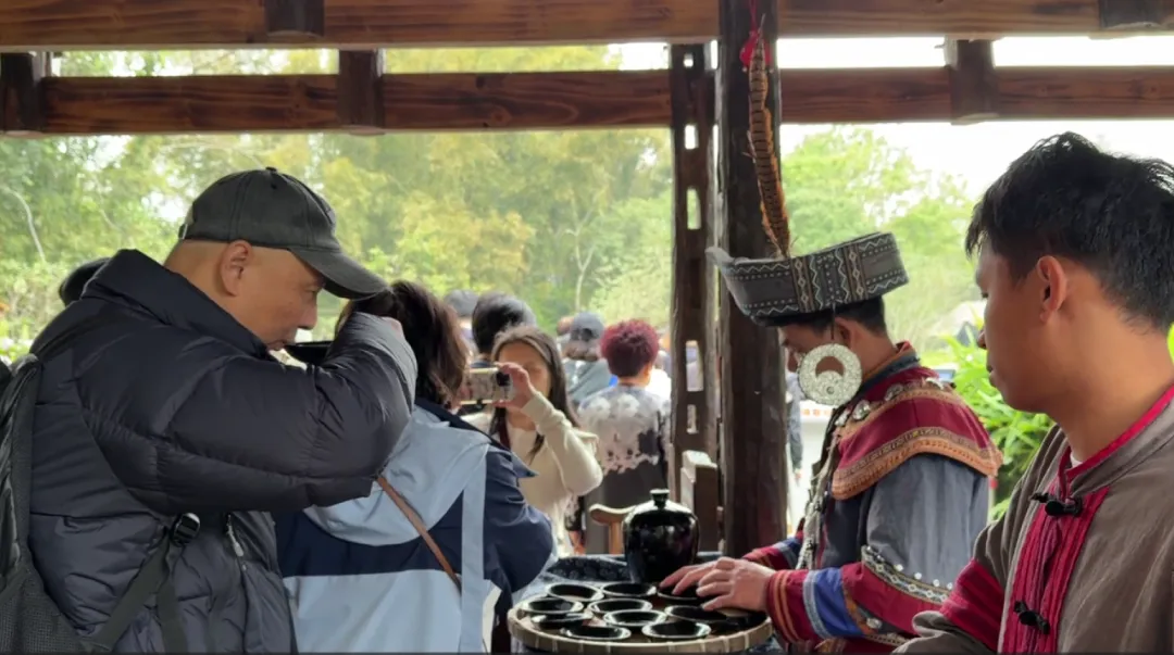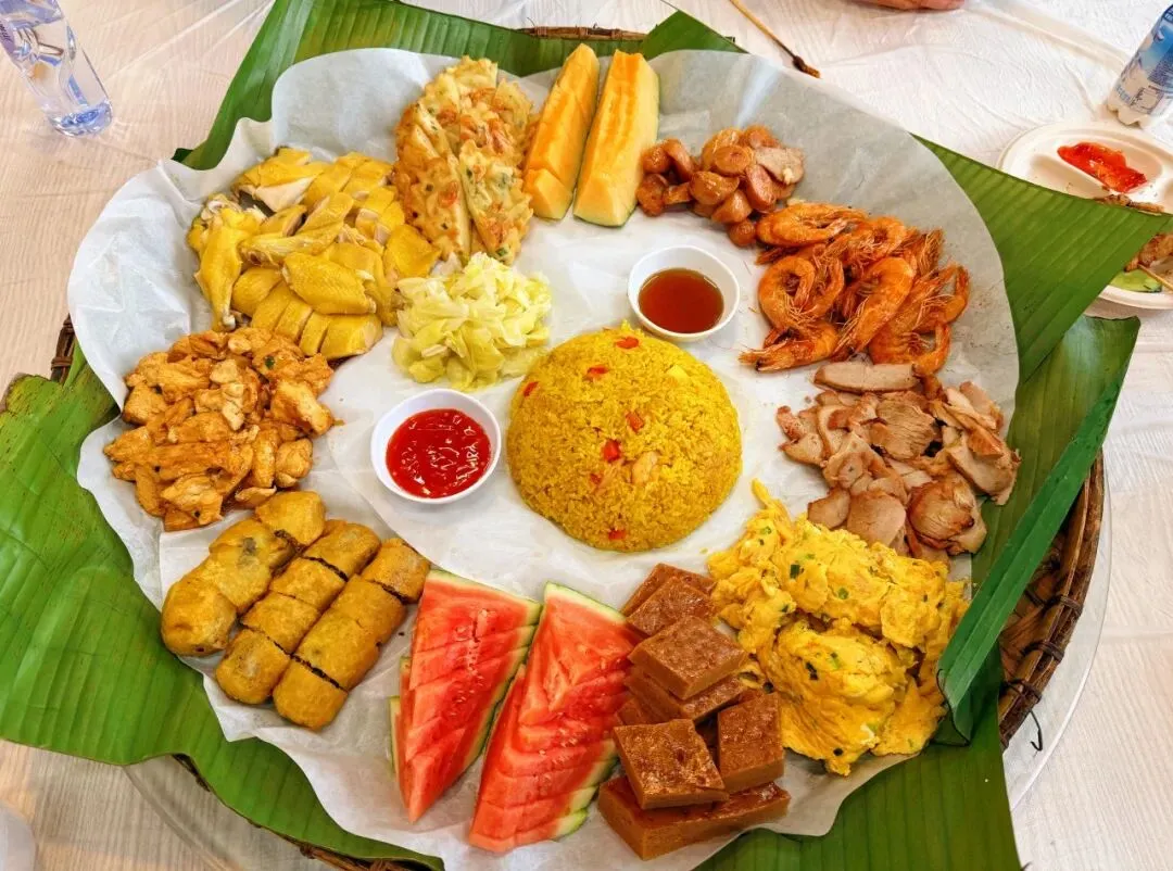 景区里的中越风情街,主打民俗体验和伴手礼采购;而中越跨境街则偏向于跨境文化体验,在某些时段还会有中越歌舞表演,我们在这里吃了一顿簸箕宴,说句实话,味道只能算差强人意,但簸箕摆盘倒是十分可爱。
