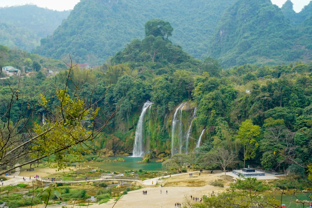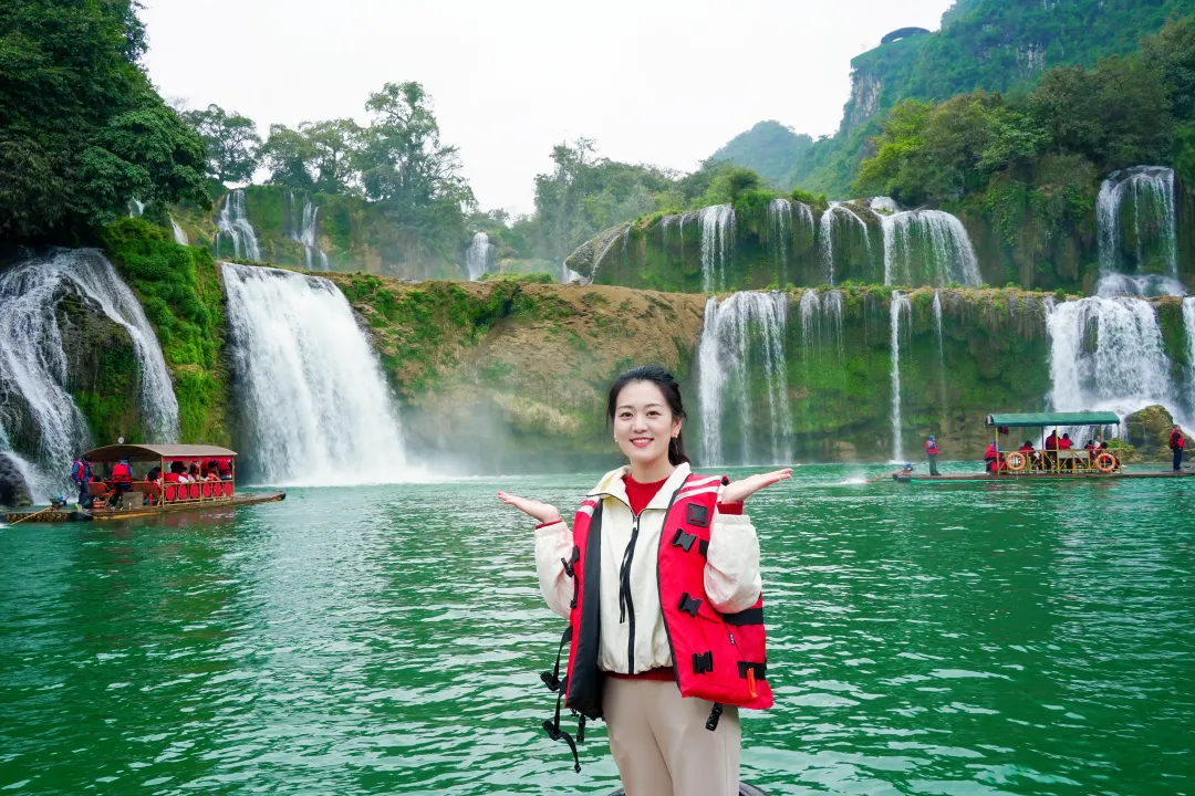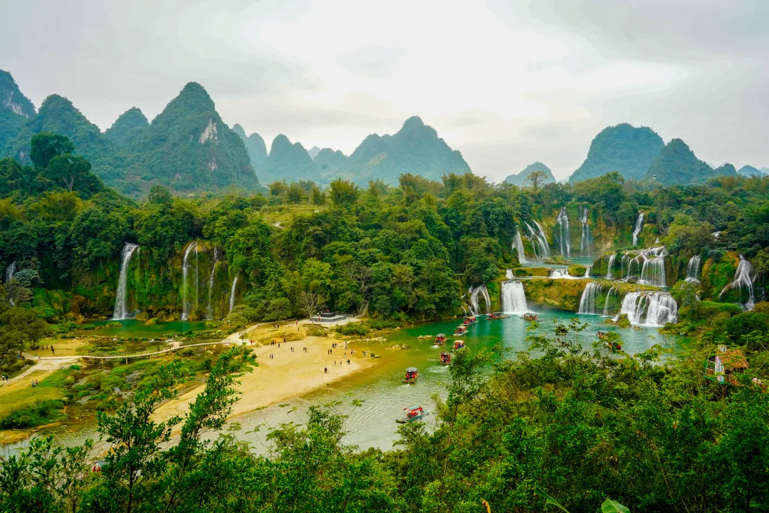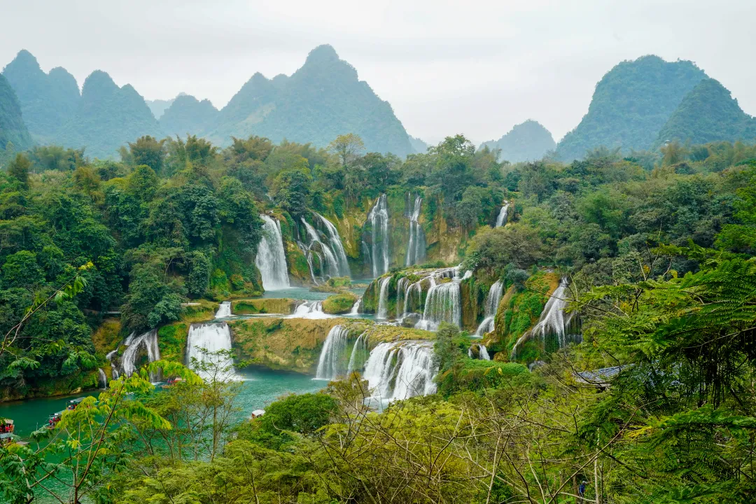 枯水期的德天瀑布,水流量可能只有夏天时的一半都不到,可即便如此,从那长达百米的宽展岩壁上,那些被流水常年冲刷留下的深浅痕迹,以及竹筏靠近时轰鸣的水声,依然能让人真切感受到它骨子里的磅礴气势。