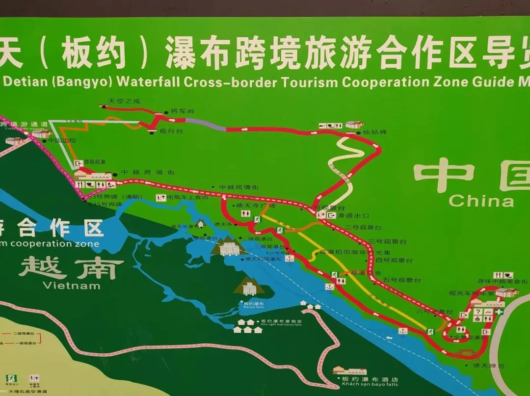如果准备坐观光车出景区,那就必须到跨境街才行。但我更推荐步行出去,不远,大概1.2公里。沿途会经过一到五号观景台,越往后走,遮挡越少,看到的瀑布景致也就越完整、越壮观。不得不承认,德天瀑布也是个极“上照”的地方,照片里定格的样子比肉眼所见还要好看,哪怕只是随手一拍。