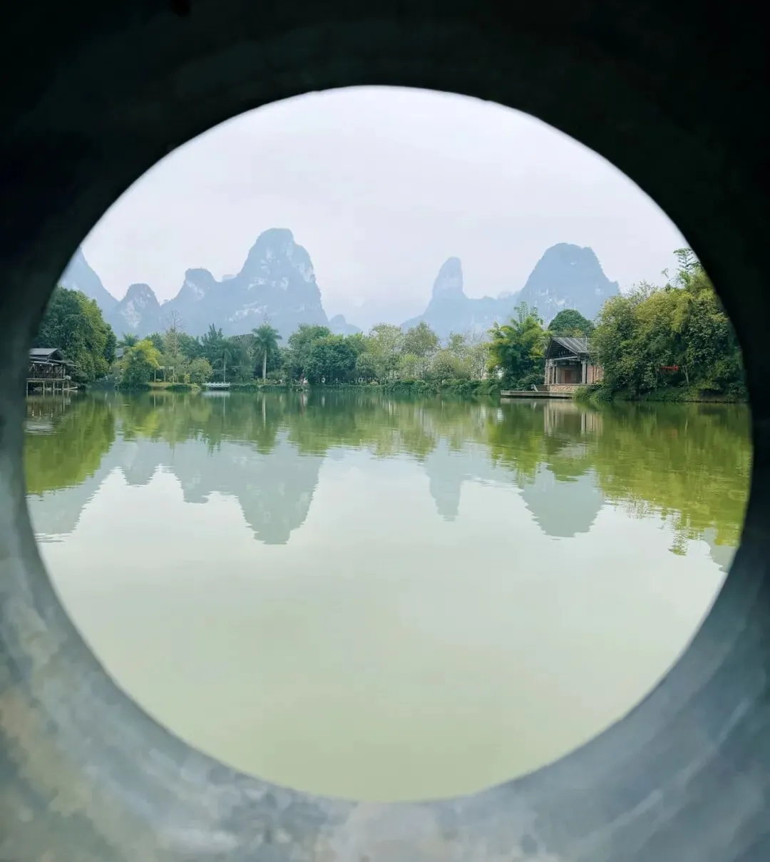 从桥洞里取景,拍向对岸的峰林与田园,美其名曰“花好月圆”。