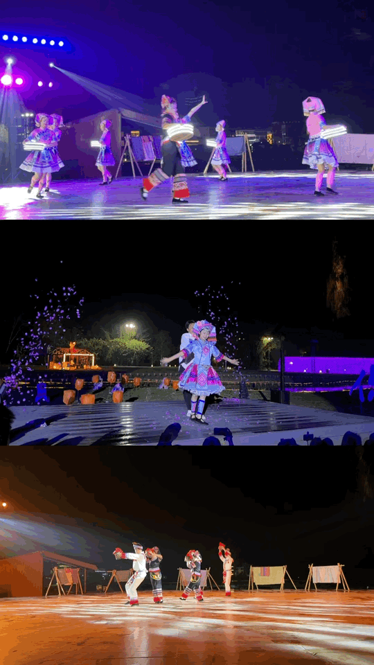 春节期间景区内安排了不少夜游活动,除了彩灯会、篝火晚会、烟花秀这些,在田园综合体的中心广场,还上演了一出情景互动舞剧。这真是名副其实的沉浸式演出——演员们跳完一个场景,便即刻转场到下一个舞台,我们这些观众,也只能跟着在几个舞台之间来回奔波……看个演出,竟要连着跑好几个100米,难道这就是“奔跑在希望的田野上”?