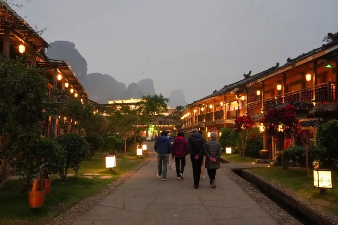 酒店装修借鉴了壮族传统民居样式,有独立的庭院,雅致清幽,其本身就是景区里一道亮丽的风景。但这同时也是它的弊端——来来往往的游客比较多,虽说隔着庭院的围栏,外人进不来,但如果不拉窗帘,房间里的动静,外面的人都能看见,少了几分私密性。