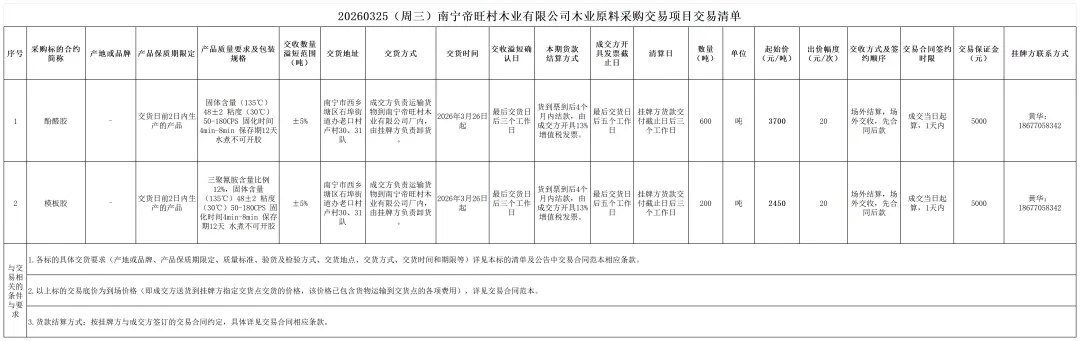20260325(周三)南宁帝旺村木业有限公司木业原料采购交易项目(二)采购标的如下: