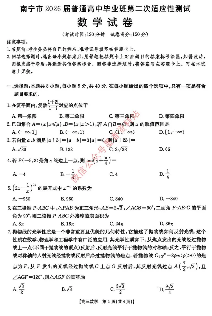 南宁市 2026 届普通高中毕业班第二次适应性测试
