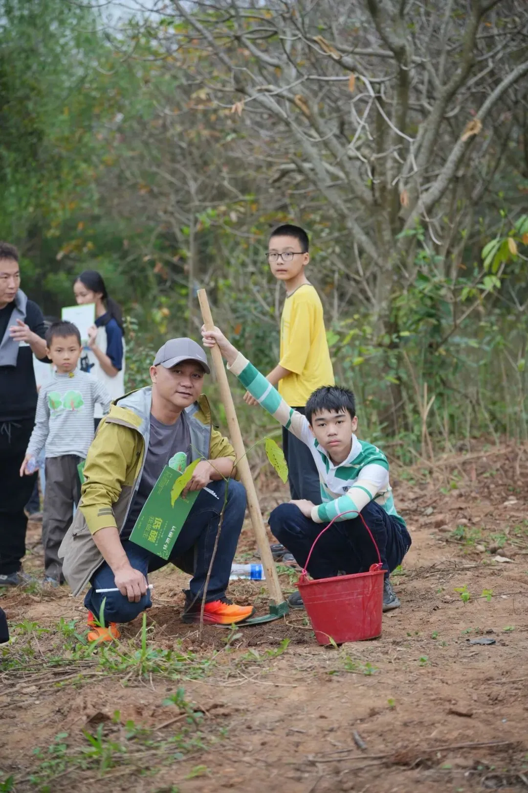研学结束后,植树环节正式开始。在协会工作人员与广西交通台主持人笑笑的共同带领下,各组家庭领取锄头、水桶等工具和树苗,前往种植区域。挖坑、扶苗、培土、浇水……家长与孩子分工协作、配合默契,现场一派热火朝天的劳动景象。不少小朋友虽然是第一次拿起锄头,但在家长手把手的指导下,很快有模有样地完成了植树全过程。