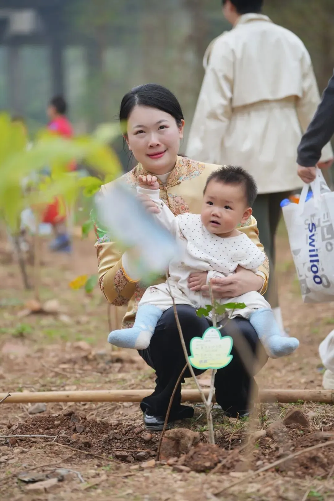 现场还有一位推着婴儿车的黄女士格外引人注目。她带着不足一岁的宝宝来到活动现场,虽然孩子还无法亲手种树,但她表示,想让孩子从小感受植树护绿的氛围,“哪怕只是闻闻泥土的芬芳、看看大家劳动的身影,也是一种特别的陪伴和启蒙。”