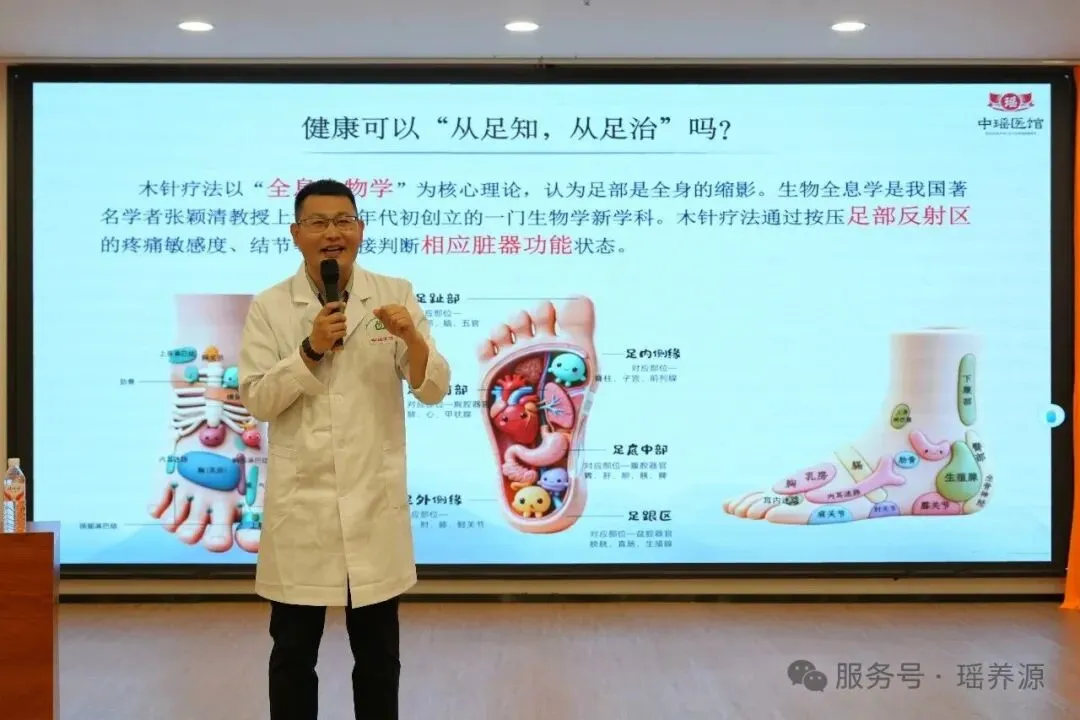 活动伊始,中瑶医馆木针疗法传承人孙国宝老师以“树枯根先竭,人老足先衰”开场,形象阐释了足底与全身健康的密切关系。他介绍,木针疗法源自古老的砭石术,现代由王仁高老师结合全息生物学理论整理发扬,形成系统的“木针反射区诊疗法”。当人体脏腑出现病变时,会通过经络表现在足底特定区域,形成结节或压痛点。通过木针刺激这些反射区,就能调节对应器官功能,实现疏通经络、平衡阴阳的效果。