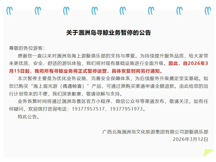 近日,“涠洲岛”微信公众号发布寻鲸业务暂停公告,称3月15日起,涠洲岛所有寻鲸业务正式暂停运营,具体恢复时间另行通知。