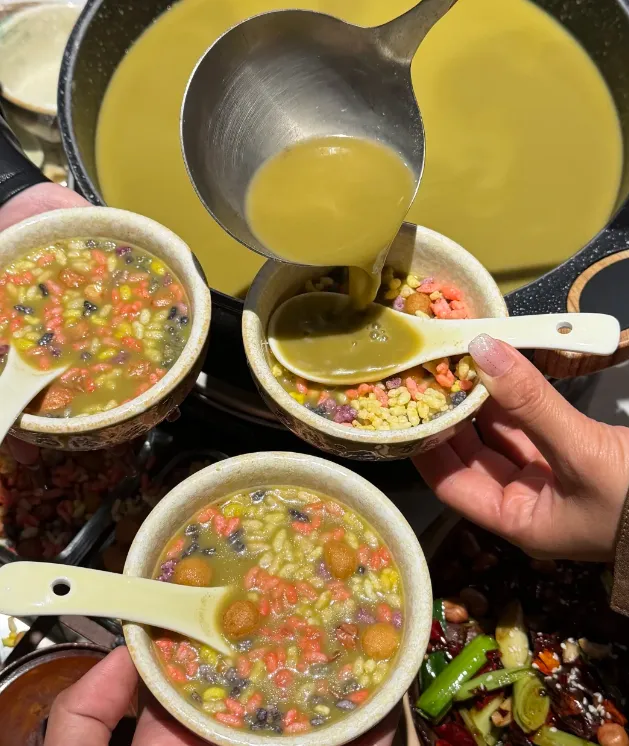 金秀油茶做法不复杂。茶叶先和姜、蒜一起捶碎,下锅慢炒,炒到香气出来,再冲水煮开,滤出茶汤,最后撒上炒米、花生、葱花,有些店还会配糍粑或小麻花。喝的时候先是微苦,后面回甘,嘴里慢慢暖起来。