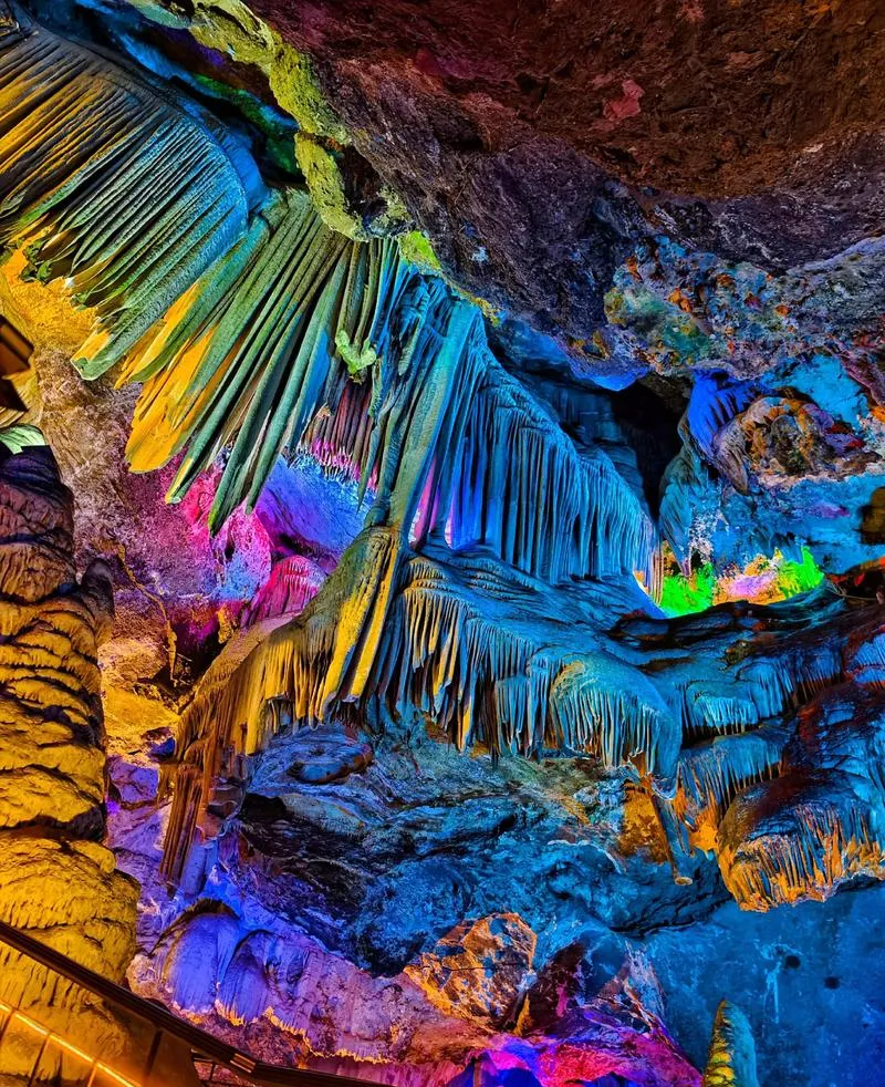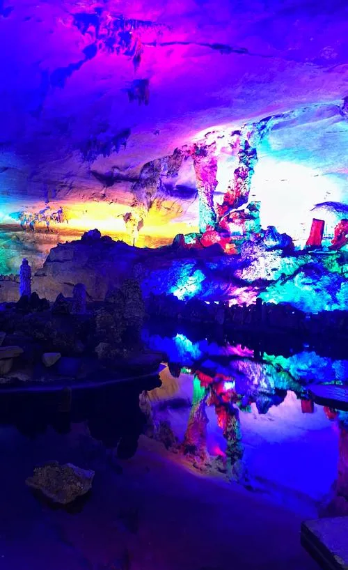 有一处是洞底积了一滩浅水,水面完全静止,灯光从侧面打过来,把洞顶的钟乳石倒映在水里,那个画面是对称的,上下两个世界,你分不清哪个是真的哪个是倒影,这种视觉错位会让你的空间感暂时失效,就那么几秒钟,你会有点恍惚,然后你突然理解了什么叫"如梦如幻"这四个字,它不是一个形容词,是一种真实的知觉体验。