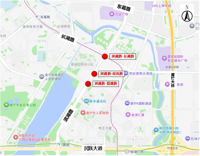 滨湖路(碧湖路-长湖路)路段位于南宁市青秀区,是南北走向的城市主干道,北起东葛路延长线,南至民族大道。该路段分布有滨湖路-长湖路、滨湖路-祥宾路、滨湖路-碧湖路三个路口,周边汇集了大型商场、多个居住社区、医院及学校,日常通勤、就医、就学及消费的车流、人流量巨大,交通压力尤为突出。