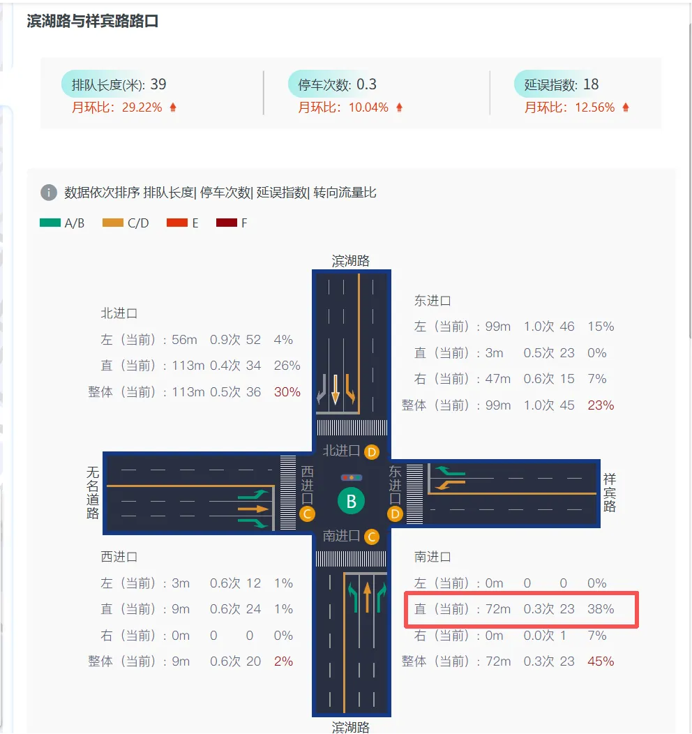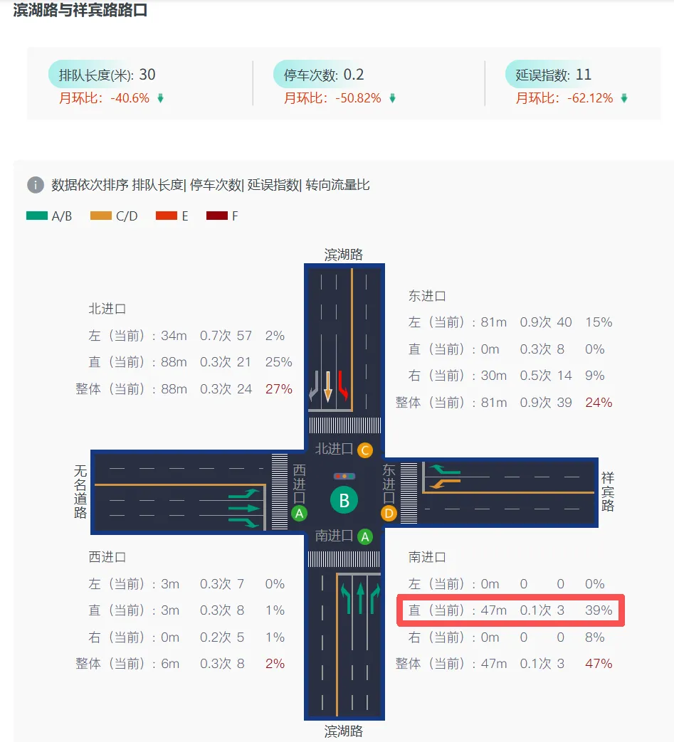 1.滨湖路-祥宾路交叉口:优化后南进口整体通行效率有所提升,排队长度由72m缩短至47m,下降了34.7%;延误指数由23减少至3,下降了86.9%。