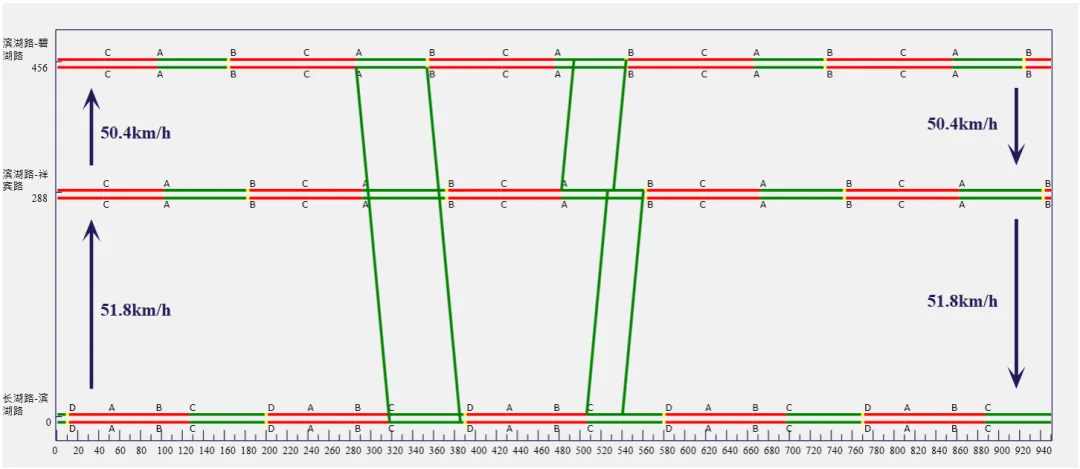 根据滨湖路(碧湖路-长湖路)路段的交通流时空分布特征,通过实施统一信号周期、优化协调相位差等绿波协调控制策略,采取差异化协调方案:晚高峰时段主要设置南往北方向绿波协调,北往南方向则实现部分绿波效果,减少车辆停车次数。