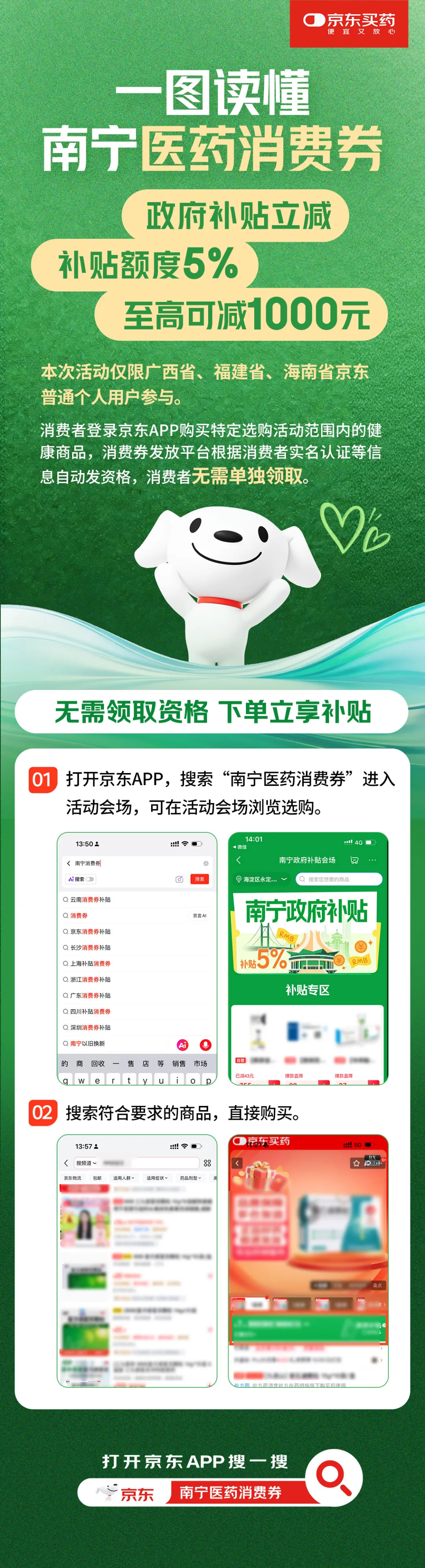 赶紧动动手指,打开京东APP搜“南宁医药消费券”,95折药品补贴,满1元就能用,把健康和实惠一起带回家!