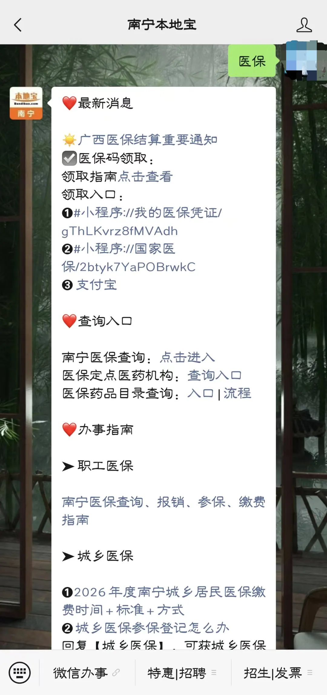 在南宁本地宝对话框回复【医保】,可获取南宁医保查询入口,还有医保报销、参保、缴费指南,定点零售药店名单及医疗机构查询。