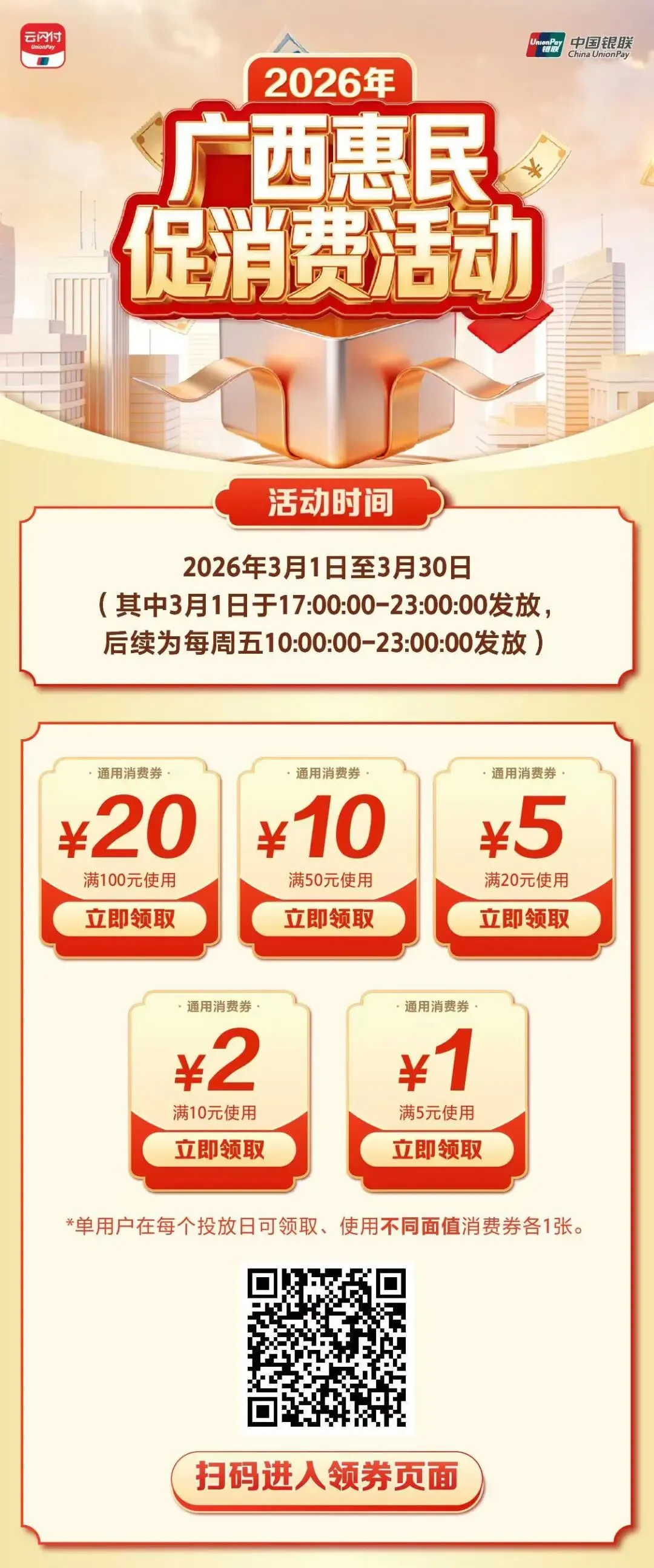 每周五上午10:00,登录云闪付APP,进入“广西消费券-五重礼”页面,就能领取观赛优惠券!买球票、逛赛事市集都能用,数量有限,先到先得~