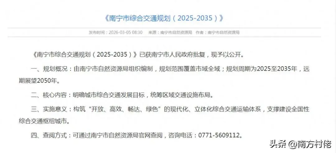 其实,早在2025年12月,这份《南宁市综合交通规划(2025-2035)》(以下简称《规划》),就已经正式获南宁市政府的批复,但获批后仍有很多修改、调整的工作要做,因此才会到2026年3月才正式对社会公布。