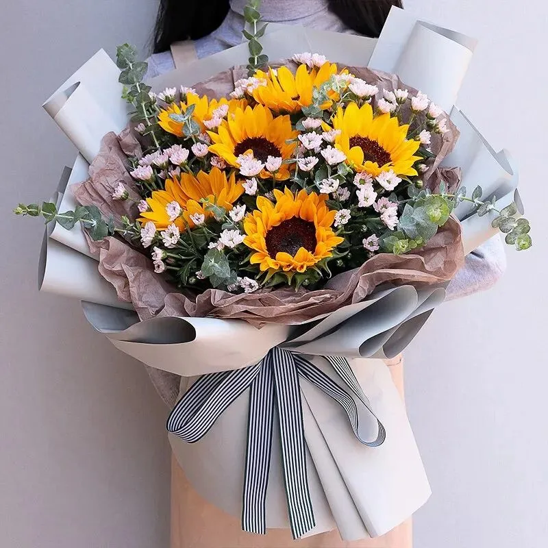 向日葵+香槟玫瑰+尤加利叶,适合送给奋斗中的朋友;单支向日葵+牛皮纸包装,简约清新,适合日常赠礼。