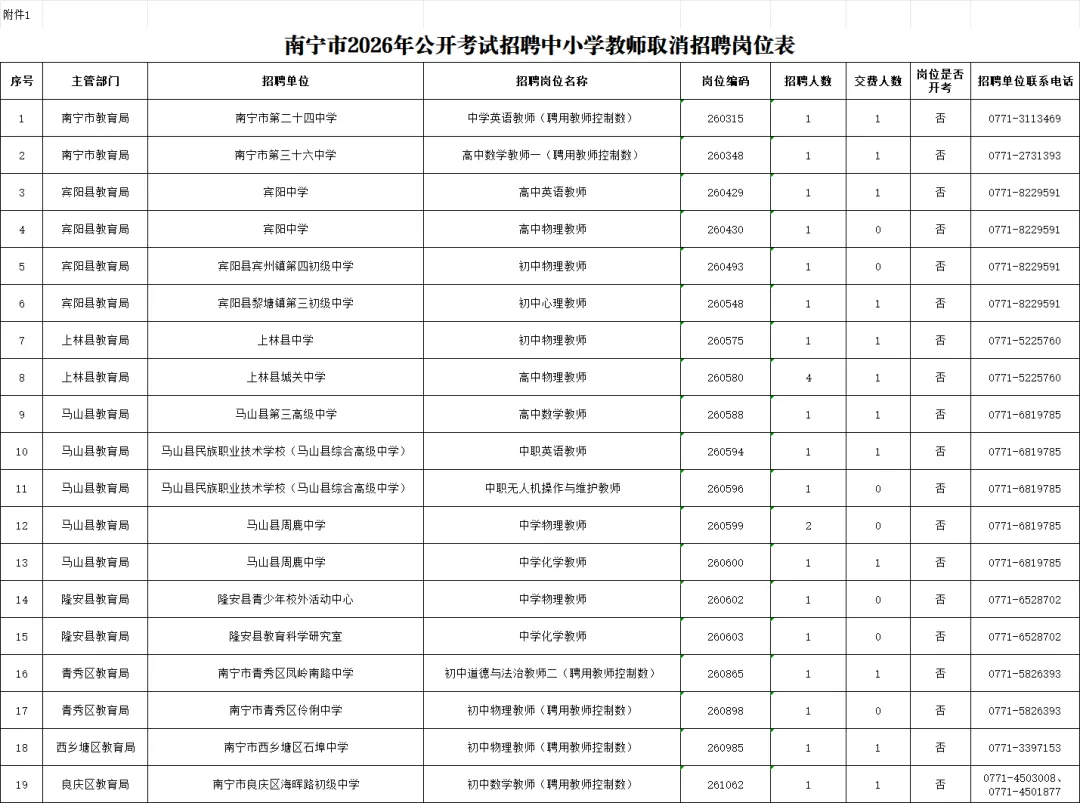 1.南宁市2026年公开考试招聘中小学教师取消招聘岗位表