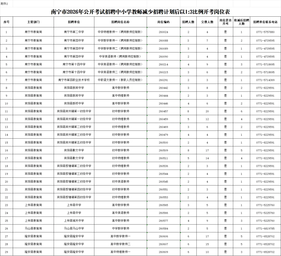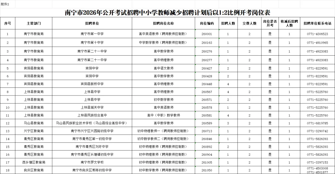 南宁市2026年公开考试招聘中小学教师报名网上资格审查工作已经结束。根据《南宁市2026年公开考试招聘中小学教师简章》有关开考比例规定,结合报名资格审查、交费等情况,现将减少招聘计划后以1:3比例开考的岗位、减少招聘计划后以1:2比例开考的岗位、取消招聘计划的岗位予以公布。