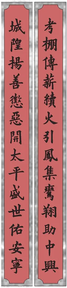 遗憾的是我的对联被拿去篡改,结果就是大家现在看到的版本:“穿越千年,考棚名后世 ;祥和四季,古庙祀前贤”。理由是我写的平仄不够对仗,没有“仄起平落”,背面的对联也被取消。殊不知壮丽的文化气象比所谓的平仄八股更有意义,况且现版本也不严谨,“穿越”二字使得古意盎然的图景破功,“穿越”与“祥和”不对仗,没有“城隍”二字文化份量不够。还指定要用启功体,殊不知启功体的“柳叶字”过于纤细,不如浑厚的榜书更适合用于建筑。但内容往我的方案靠近了一些,东施效颦,也总算点题“考棚”与“古庙”,不像之前那样跑题。另外,对联黑白色不喜庆。后来魏主席幽默地对我打趣说:“他们像刚进大观园的刘姥姥,没文化,写不好,还得是你提升了文化,一下子就写出来了,哈哈……”。对于领导的肯定,我虚怀若谷,我只是抛砖引玉,期待将来换上比我的版本和现版本更好的内容,还有喜庆的朱砂红底色。
