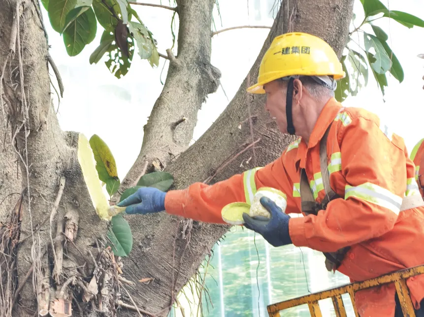修剪后,养护人员给树木“伤口”涂抹愈合剂,减少绿化植物损害。