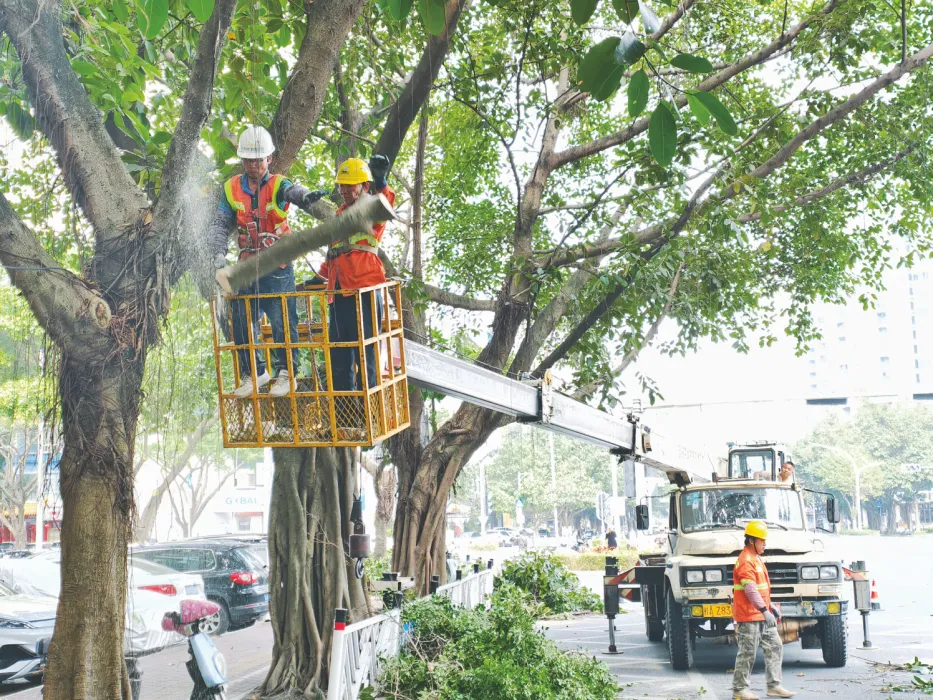 3月23日,记者在长湖路附近看到,南宁市绿化工程管理中心养护人员在对人行道一侧的高山榕、垂叶榕等绿化树木开展修剪作业。两名养护人员站在高空作业车上,使用油锯等工具清理遮挡高杆灯的枝条。修剪完毕后,他们还为树木“伤口”涂抹愈合剂,降低绿化植物损害。经过1个多小时的现场作业,绿化树木呈现冠幅匀称、形态舒展的良好状态,绿化空间通透性与层次感显著增强,城市道路风貌焕然一新。