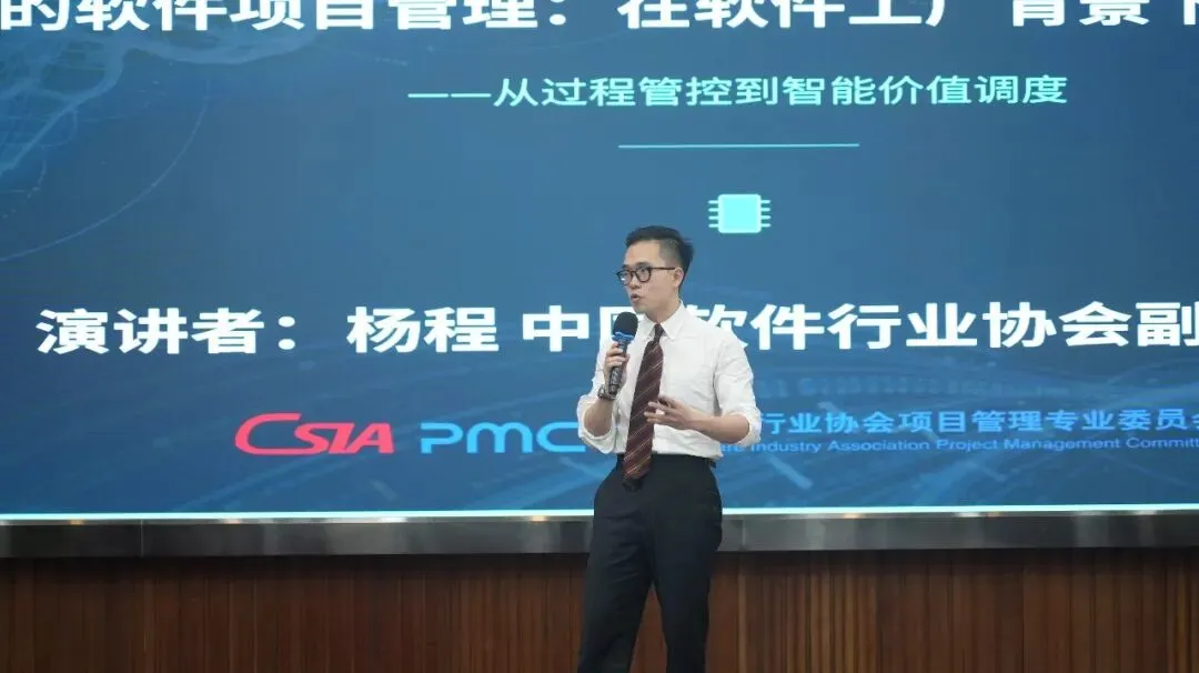 中国软件行业协会副秘书长、国防科技大学副教授杨程先生带来题为《AI时代的软件项目管理:在软件工厂背景下的演进与未来——从过程管控到智能价值调度》的主题分享(见图7)。杨程副秘书长的分享全面而深入,他从软件工厂的兴起背景切入,系统阐述了AI技术如何渗透研发全流程,并前瞻性地描绘了未来项目管理者的能力模型。他核心指出,数智化项目管理标准将为AI战略落地提供全方位支撑,而项目管理者的角色也将随之深刻转型——从传统的过程管控者升级为统筹业务价值与智能研发体系的总调度官。图7 中国软件行业协会副秘书长杨程进行主题分享