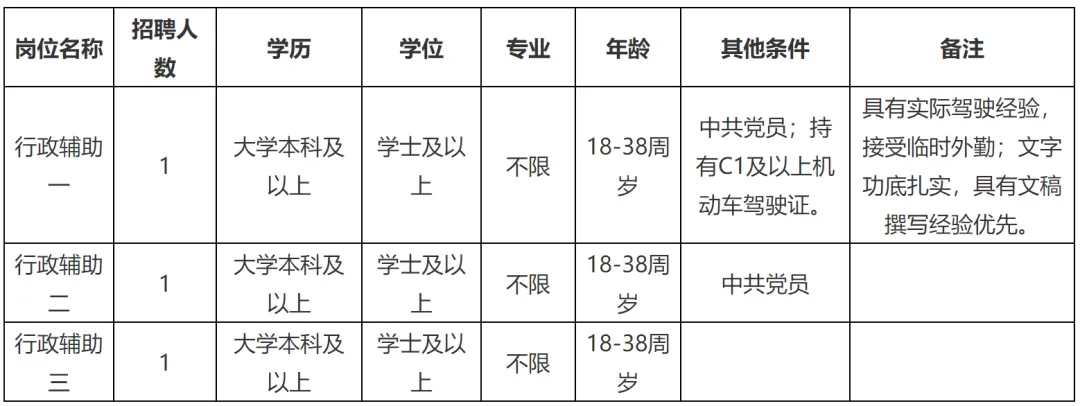 (一)本科及以上学历并取得相应学位,专业不限,汉语言文学类、文秘类优先;具有较强的学习能力及专业素养,熟练应用行政办公软件;中共党员、有党建工作经验者优先;