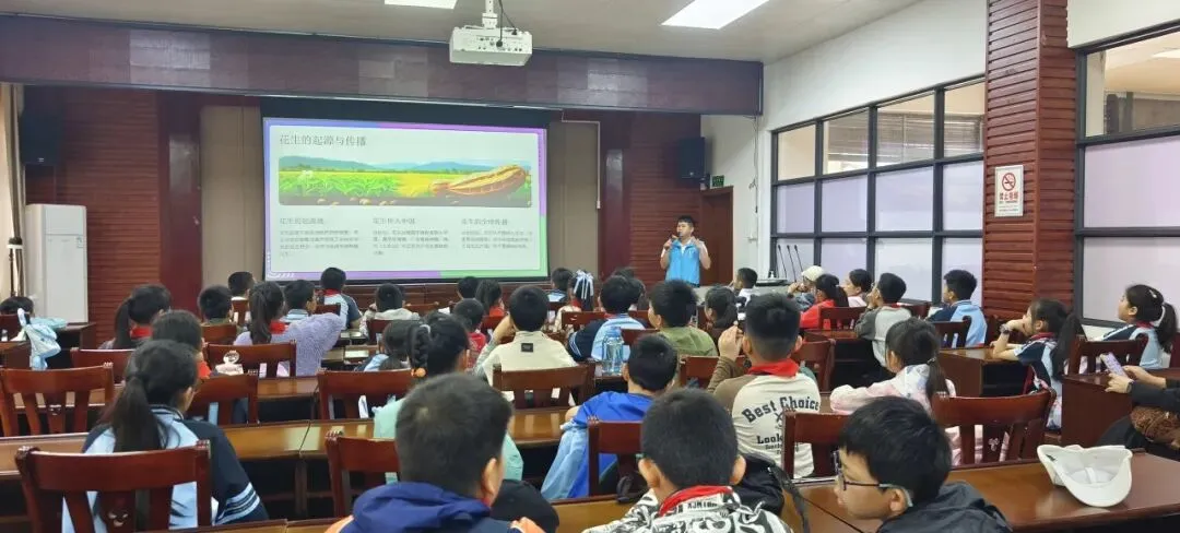 抵达实践基地后,队员们先在多媒体教室,认真聆听校外辅导员莫老师讲解花生的生长过程,辅导员用通俗的语言讲解花生从播种到结果的全周期知识,孩子们听得专注认真,提前熟悉种植基础要点,满心期待动手实践。