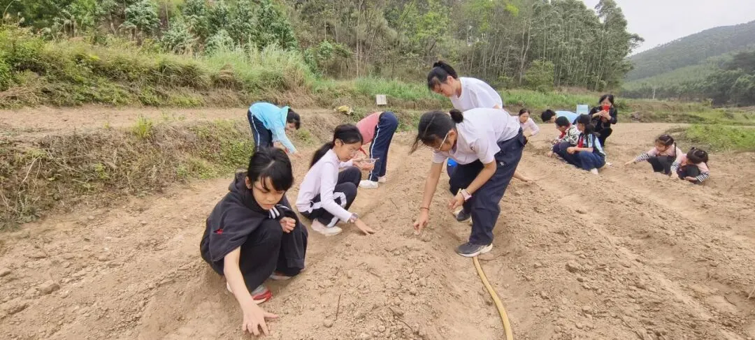 实操环节,队员们分成小组分工配合,依次完成选种、测量种植距离、播种、填土、浇水等流程,大家撸起袖子细心劳作,互相帮忙、配合默契,在亲手播种中体会农耕的不易与快乐。
