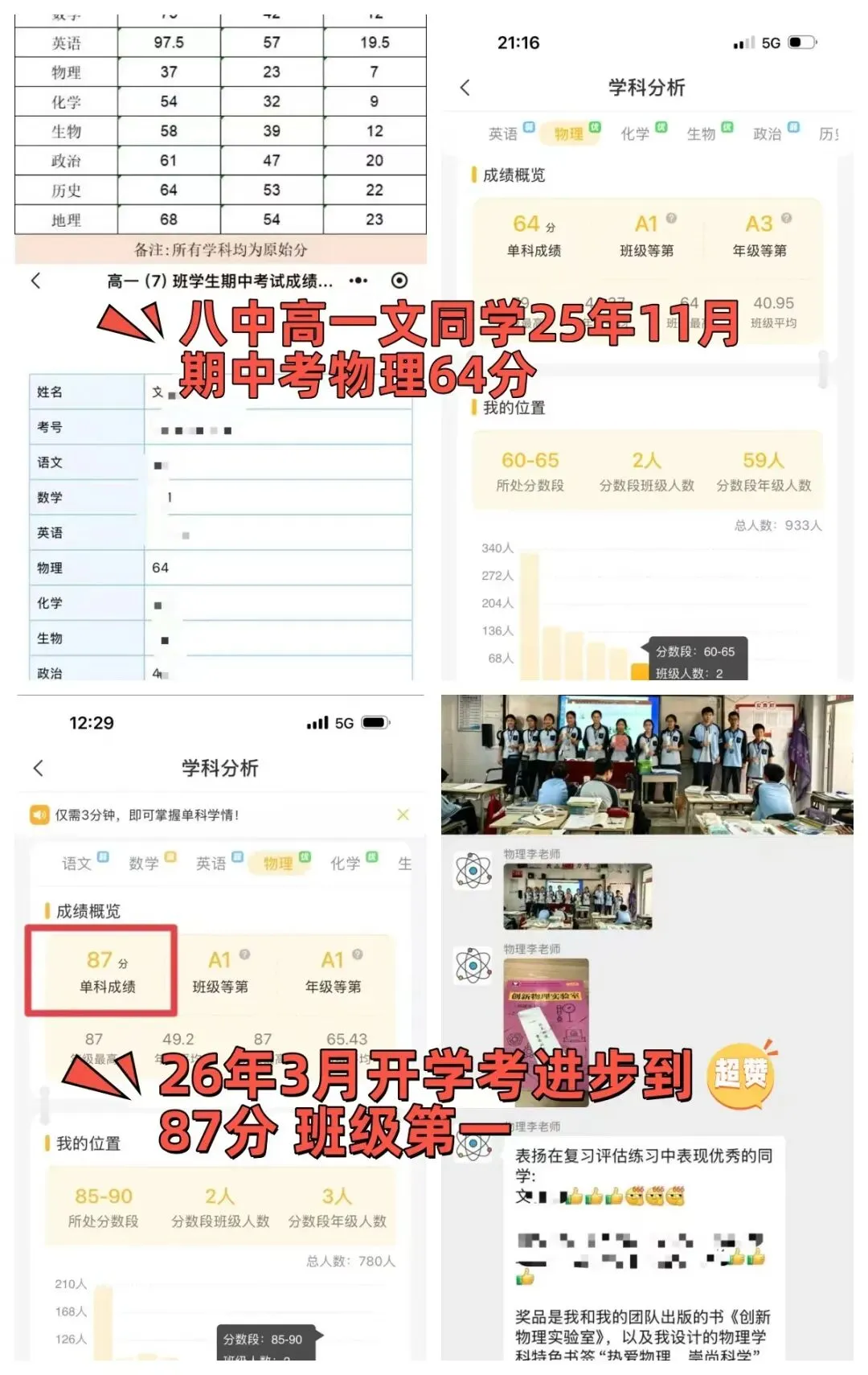 中考被八中录取,初高中衔接丝滑,成绩依旧稳步上升。老师没有急着给文同学讲难题,而是陪她从高一的基础概念重新梳理。老师特别耐心,每次做对一道题,都会给予很大的鼓励。然后文同学的物理从班级第一到年级第一。