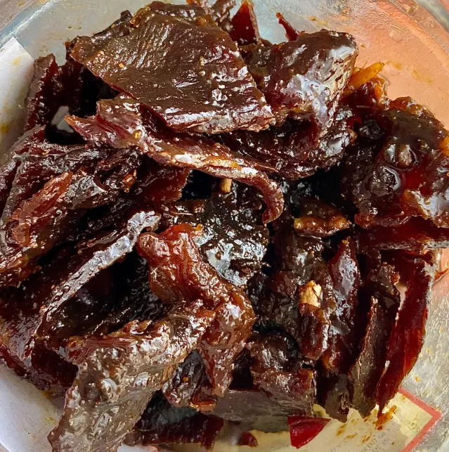 桂平牛巴做法不复杂,但挺费工。牛肉先切成长条,用酱油、糖、蒜蓉和香料慢慢腌透,再下锅反复收汁、烘干。火不能急,急了就柴。做得好的牛巴,外头微韧,里头还有肉丝感,越嚼越香。