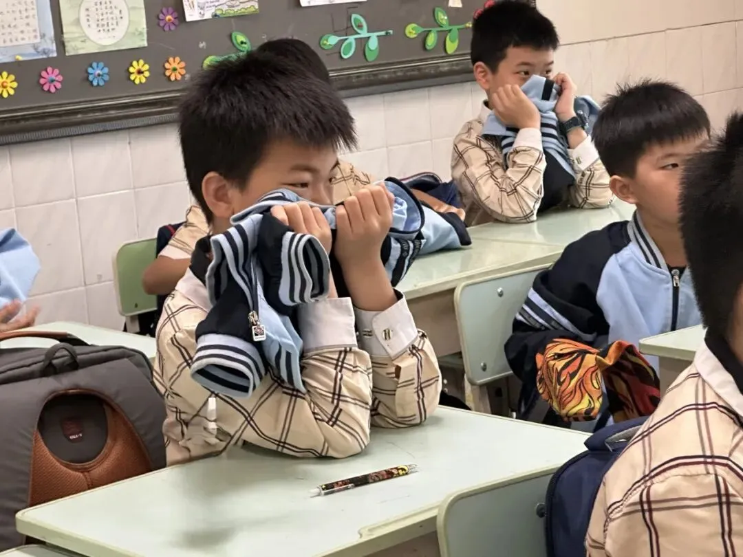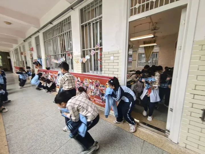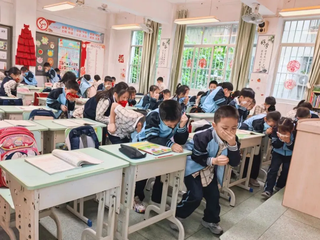 随后,校园通过广播发出避险提醒,模拟教室内电器短路起火场景。随着指令下达,各班班主任迅速发出避险口令,组织学生用湿毛巾折叠3至4层捂住口鼻,弯腰低头,沿预定路线快速有序疏散至教室外走廊安全区域。整个过程中,师生配合默契,行动迅速。同时,针对体弱或行动不便的学生,副班主任全程陪护帮扶,确保无一人遗漏。