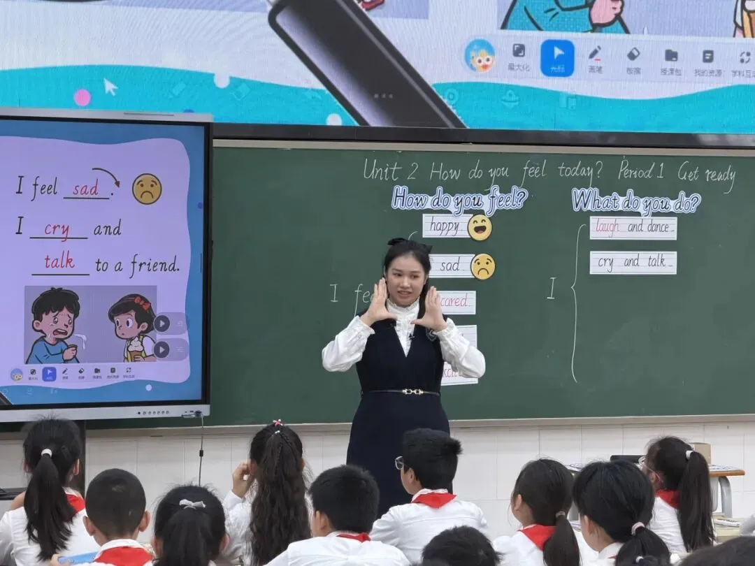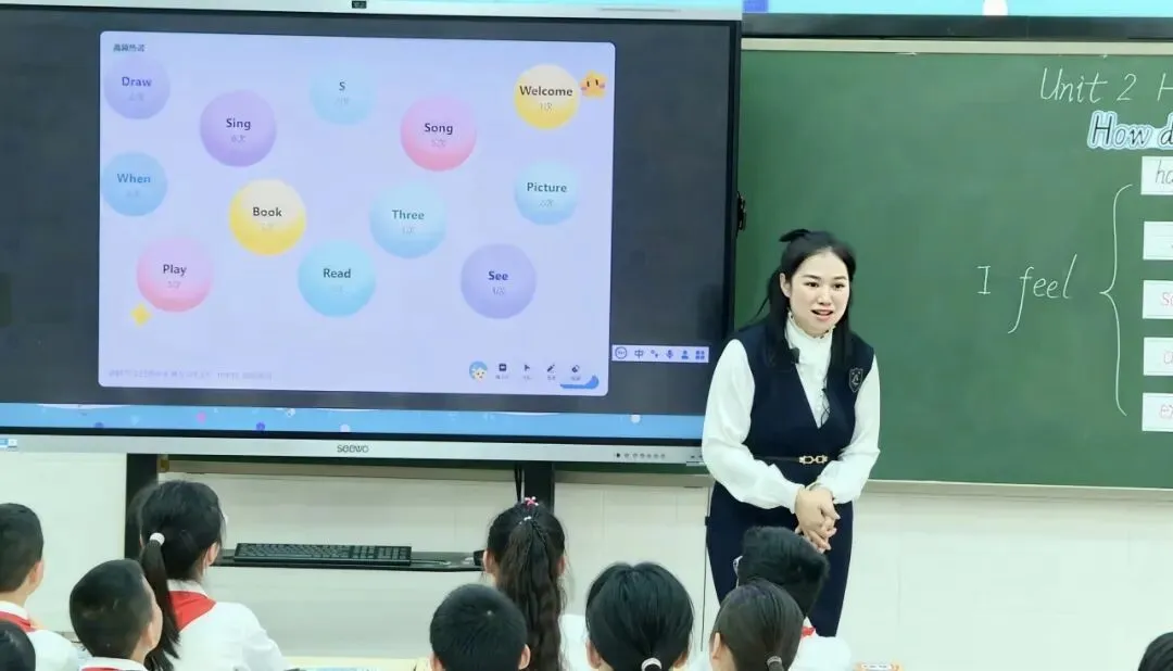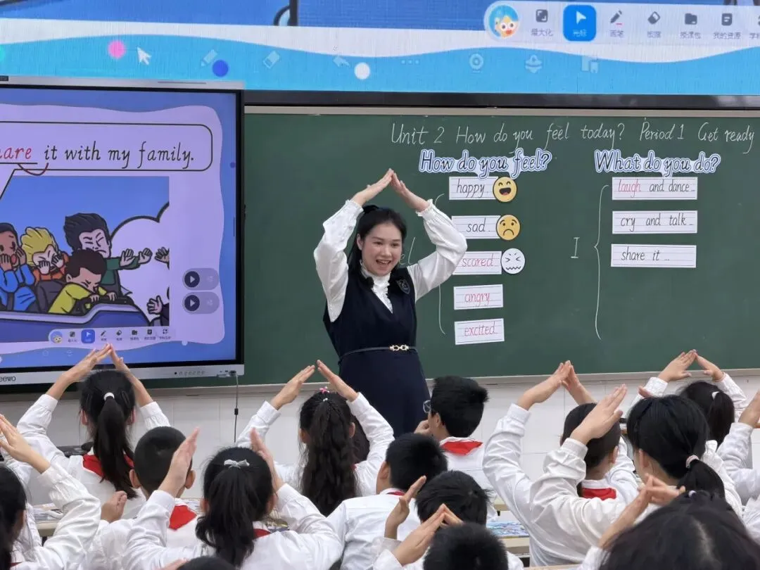 陈玉雯老师执教外研版《新标准英语》(三年级起点)四年级下册Unit 2 How do you feel today? Period 1 Get ready一课。这节课,陈老师设计了阶梯式学习活动,情境图片感知主题、课文视频获取词汇,还运用AI听说课堂系统实现精准语音纠音与实时学情反馈,让学生在“看、听、唱、演、创”的多模态体验中,扎实掌握情绪类词汇与句型。同时,AI 答题器录音、互评等数字化技术的融合,将评价嵌入教与学全过程,构建起人机互评、生生互评和自评的多元评价闭环,实现以评促教、以评促学。