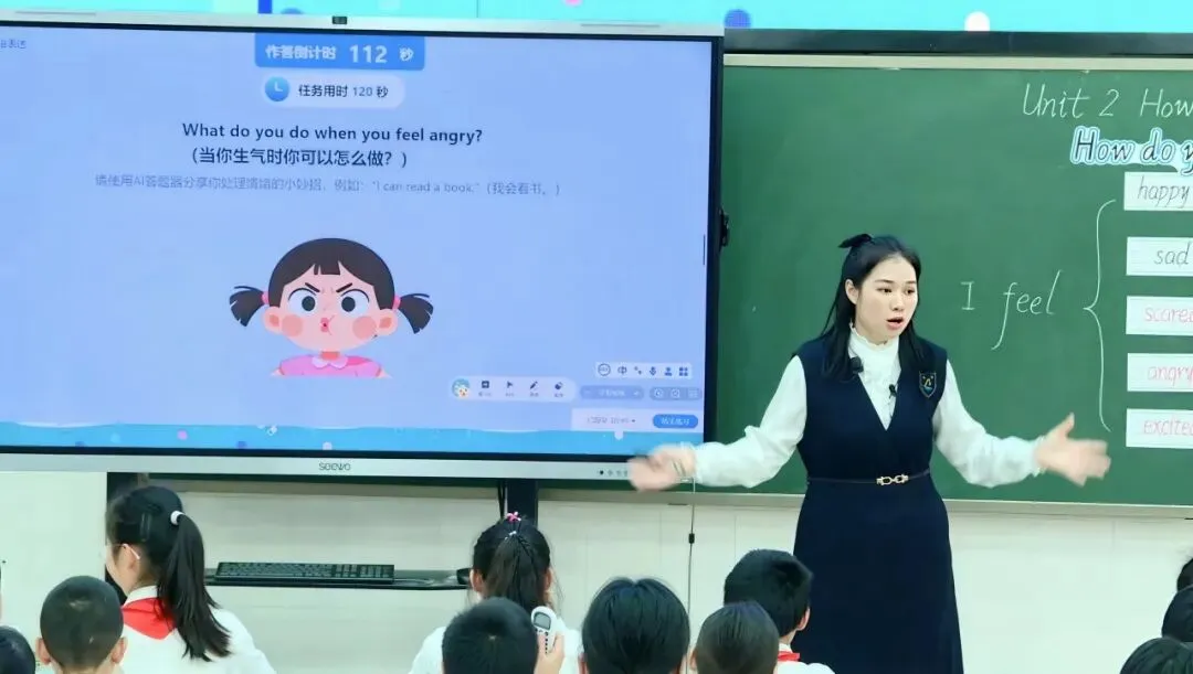 本节课的一大亮点是实现了语言教学与心理健康教育的深度融合。陈老师引导学生结合生活经验分享情绪调节方法,借助AI系统收集全班同学在面对生气时会怎么做的录音,系统快速分析全班同学的数据并生成高频热词,数据显示学生在生气时通常会用唱歌、读书和画画等合理的方式进行调节。最终以“Feel my feelings, and act in a nice way.”升华主题,让学生在习得语言知识的同时,学会体察情绪、做情绪的主人。整堂课情境生动、互动有趣,充分激发学生参与度与表达欲,显示了AI技术在赋能学生英语学科核心素养有效性方面的优势。