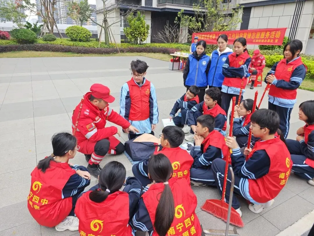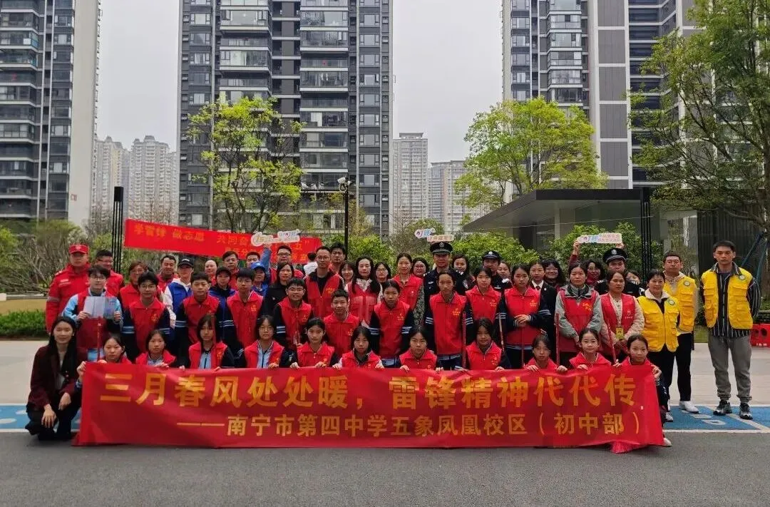 三月春风润桃李,雷锋精神植心田。为传承和弘扬新时代雷锋精神,推动校园精神文明建设走深走实,南宁市第四中学五象凤凰校区(初中部)于2026 年 3 月组织开展学雷锋系列志愿服务活动。全校师生积极参与、踊跃践行,走进社区、联动多方单位,用实际行动诠释雷锋精神,让雷锋精神在校园内外落地生根、开花结果。初心如磐向未来,雷锋精神记心间。学校利用晨会开展国旗下讲话,学生代表围绕雷锋事迹、雷锋精神时代内涵进行宣讲,号召全体同学将雷锋精神融入日常学习生活,从身边小事做起,争做有理想、敢担当、能吃苦、肯奋斗的新时代好少年。此次讲话营造了人人学雷锋、时时学雷锋、处处见雷锋的浓厚校园氛围,引导师生把崇高理想信念和道德品质转化为具体行动。志愿服务暖邻里,雷锋精神进社区。我校组织党员教师、团委学生会干部及学生志愿者走进坡洋社区,开展形式多样的志愿服务。师生们分工协作,积极参与社区环境整治、文明劝导、便民服务等实践活动,以实际行动服务群众、奉献社区。党员教师率先垂范,学生志愿者热情投入,展现了南宁四中师生良好的精神风貌与责任担当,拉近了学校与社区的距离,推动社校共建走深走实。多方携手筑防线,文明新风共传承。学校联合金象派出所及周边单位开展综合志愿服务活动。活动现场设置禁毒宣传、自救互救、交通安全、垃圾分类、图书捐赠等服务点位,学生志愿者向居民发放防艾宣传资料,学习禁毒、交通安全、急救等安全知识;同时参与小区环境卫生清扫,美化公共空间,以实际行动践行雷锋精神,传递温暖、传播文明。