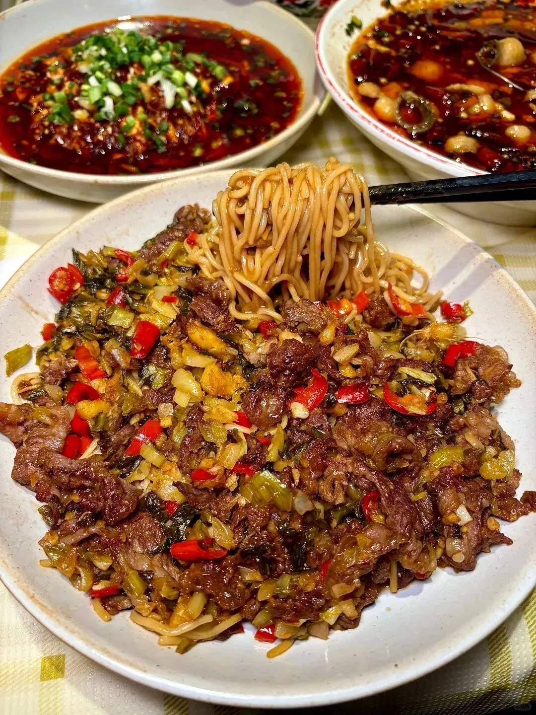 那个铺满肉丝和酸菜的拌面绝对是王炸,粗面条紧实劲道,随便一拌就裹满了浓郁的酱汁,挑起一大筷子吸溜进嘴里,酸辣开胃又极其解馋。