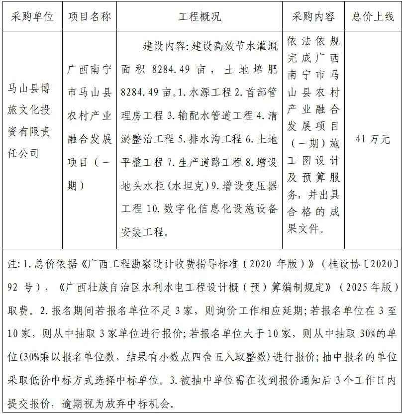 根据工作需要,我公司按照有关规定和要求,拟对广西南宁市马山县农村产业融合发展项目(一期)施工图设计及预算服务向社会公开询价采购,欢迎有意向且符合条件的单位参与报名,现将有关事项公告如下: