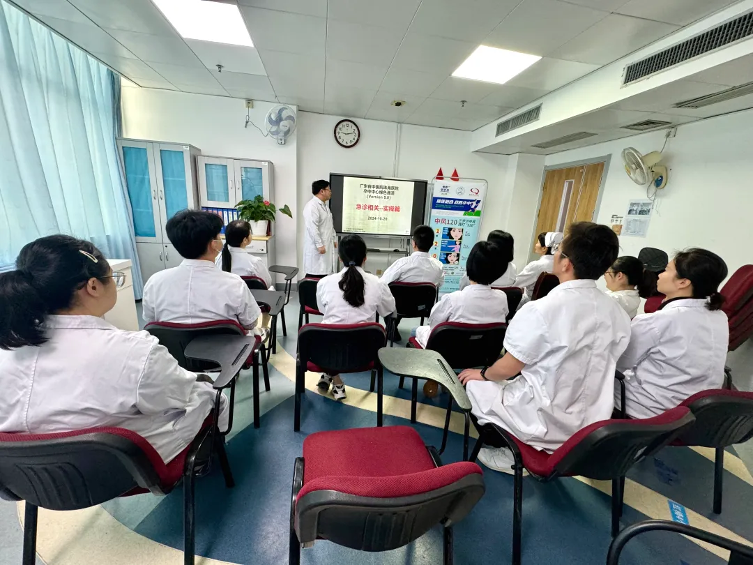 脑病科二病区副主任苏锦勋还在院内对新入职员工及全体规培学员开展了卒中急救知识培训,从脑卒中患者的早期识别、救治及卒中绿色通道流程等多角度对参与活动人员进行了专业的培训,介绍了脑卒中中心创立的意义及必要性,并强调院前急救对脑卒中患者生命挽救争分夺秒的重要意义,以更大程度及时、有效救治急性卒中患者。