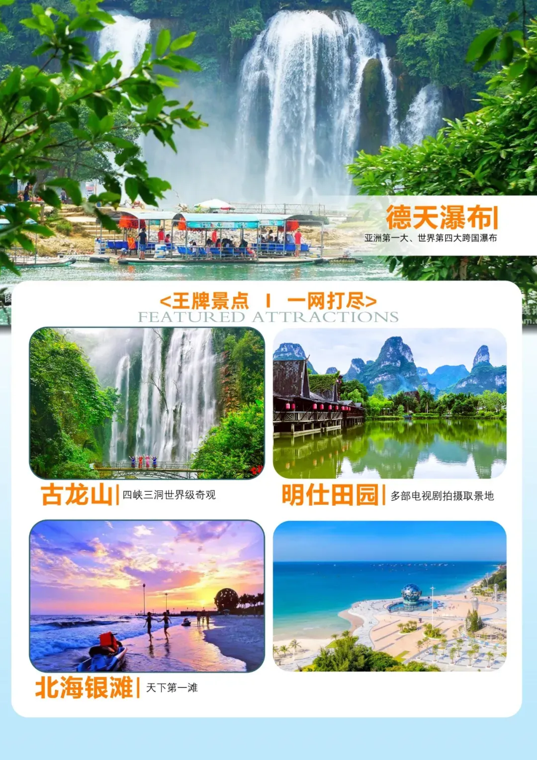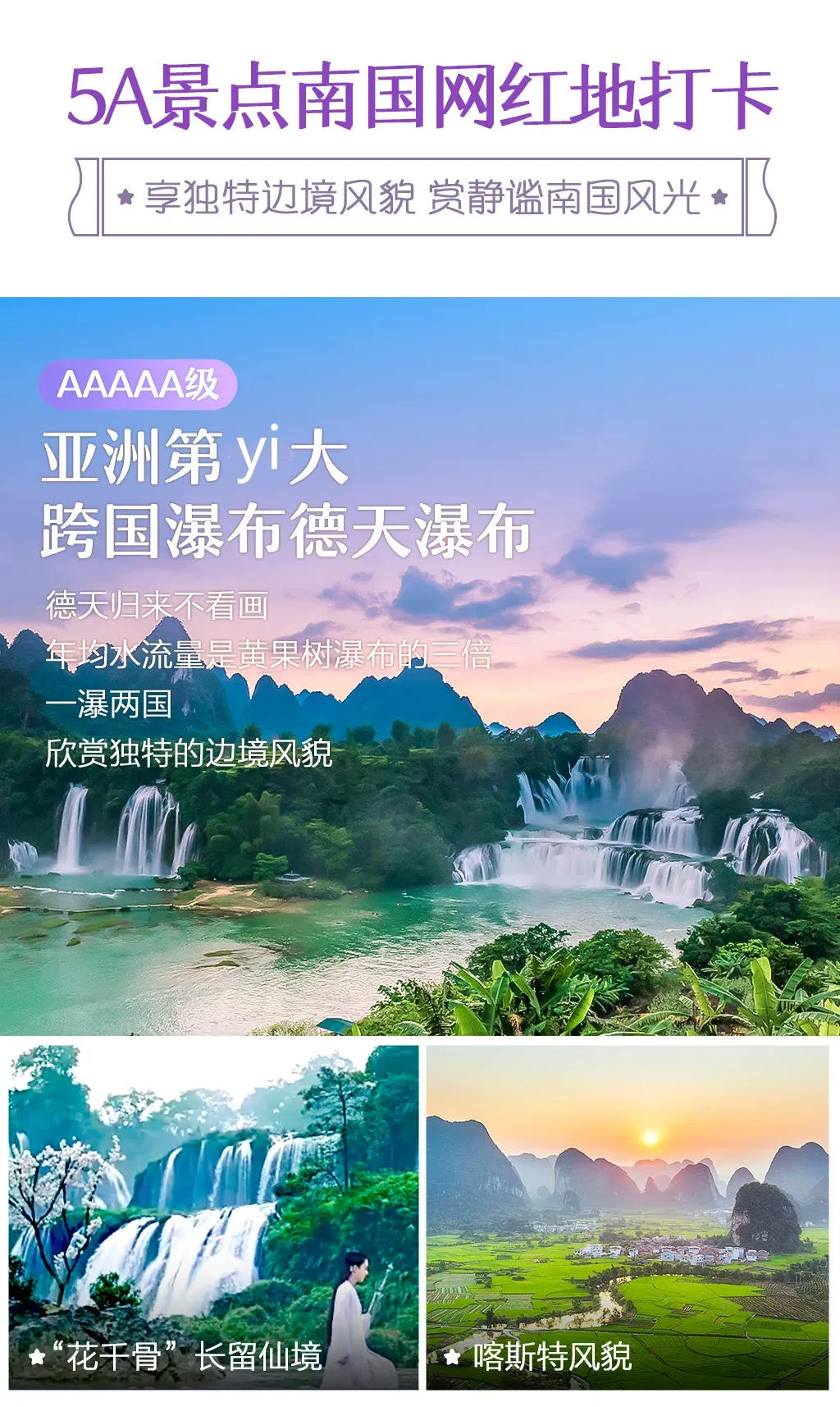 3.德天景区内电瓶车(单程10元/人)、竹排(48元/人)以及所有景区内的集市非旅游行程推荐的自费项目和购物项目,由此产生的费用自理;